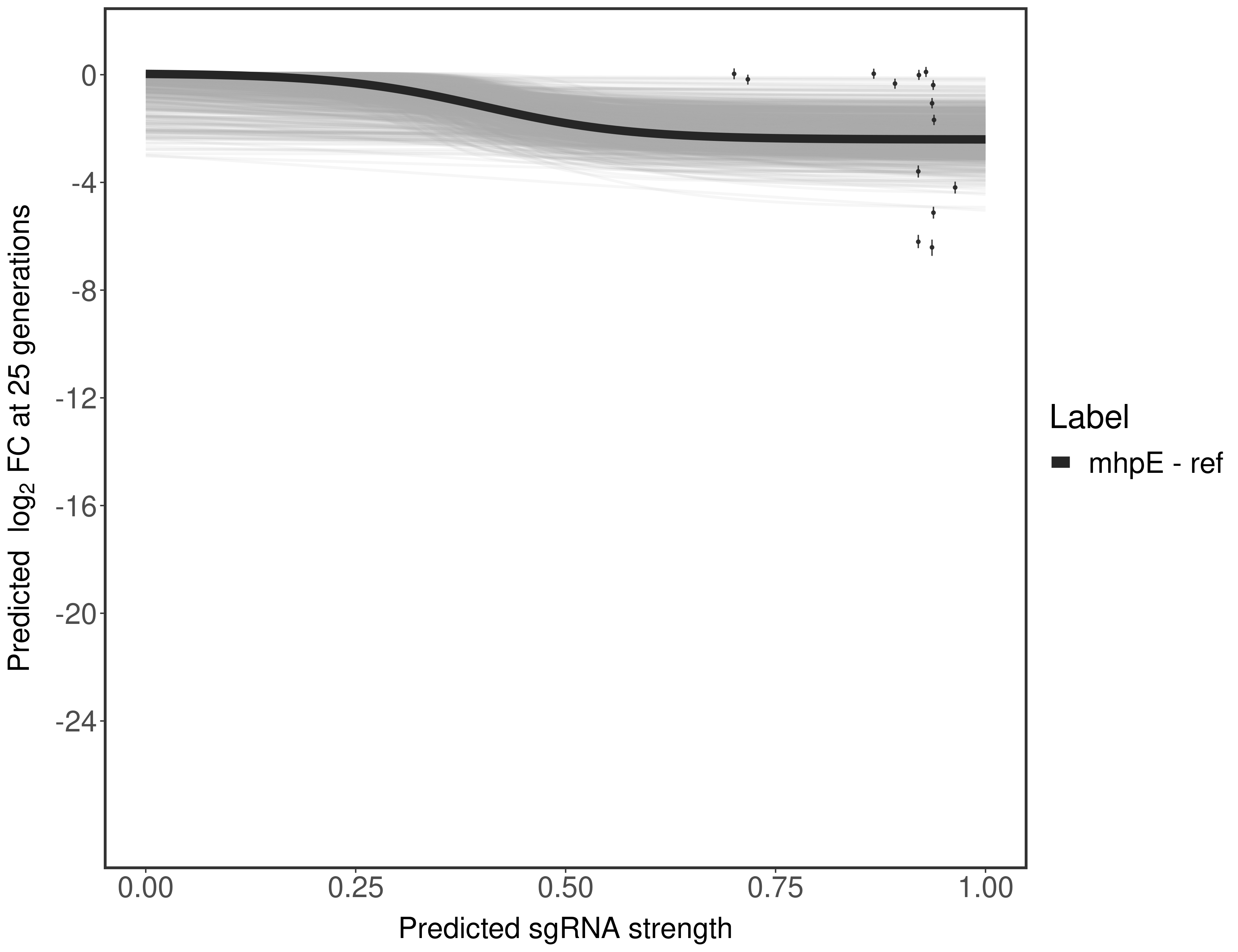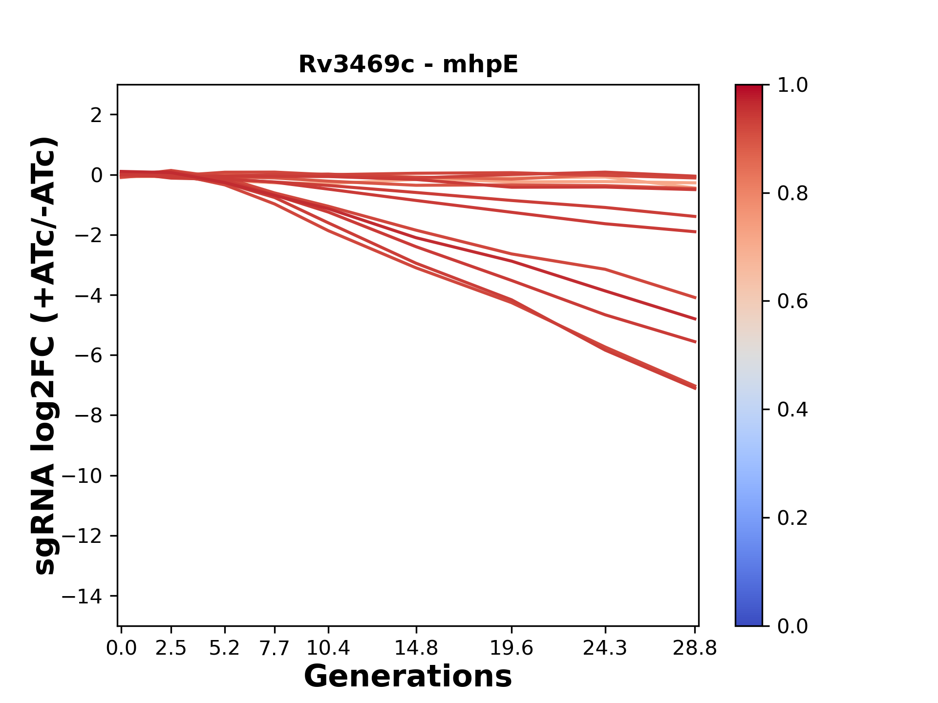 Here, we show sgRNA log2 fold-change values (L2FC) (plus versus minus ATc) over consecutive generations for sgRNAs targeting the gene you selected.