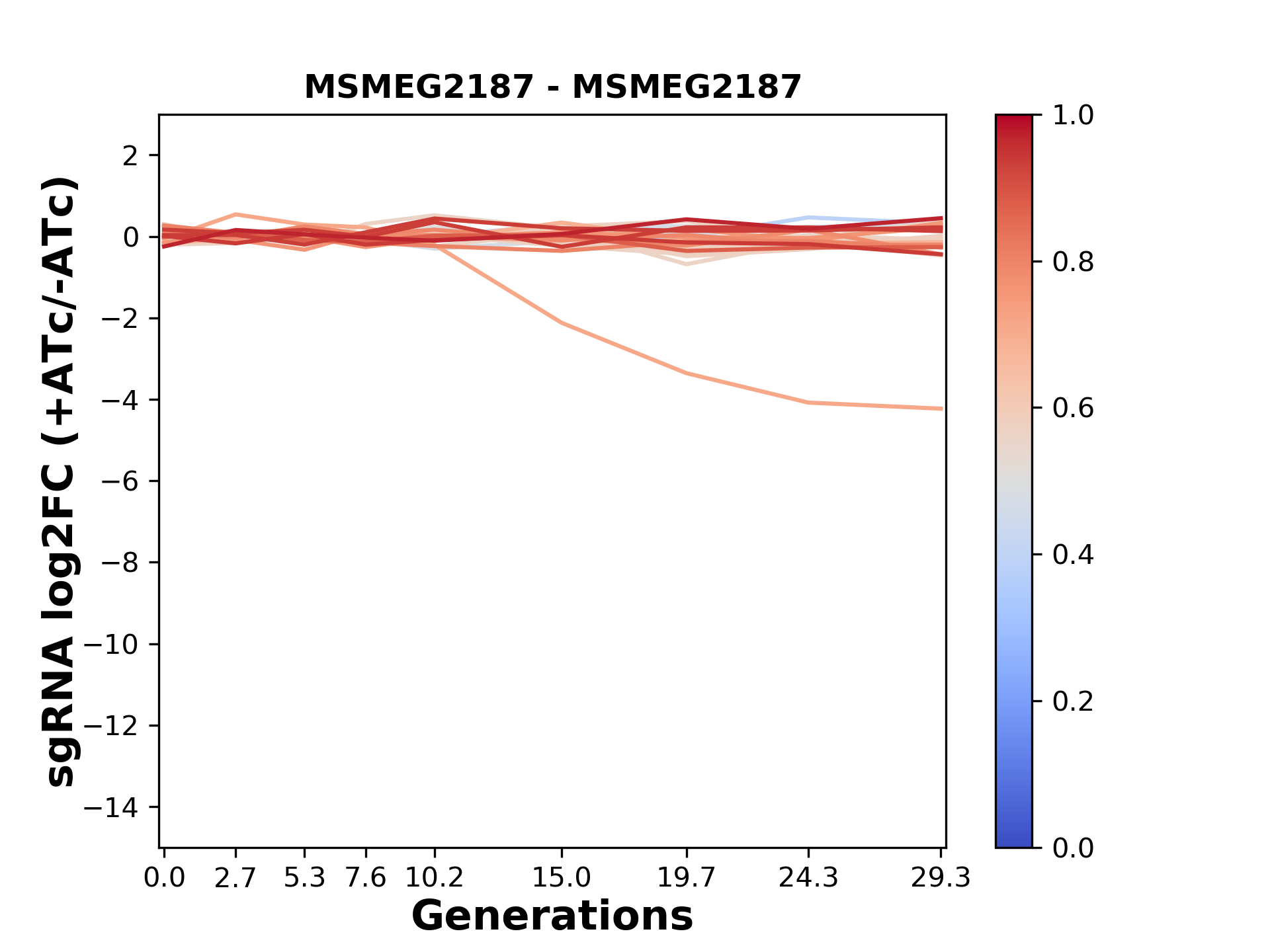 Here, we show sgRNA log2 fold-change values (L2FC) (plus versus minus ATc) over consecutive generations for sgRNAs targeting the gene you selected.