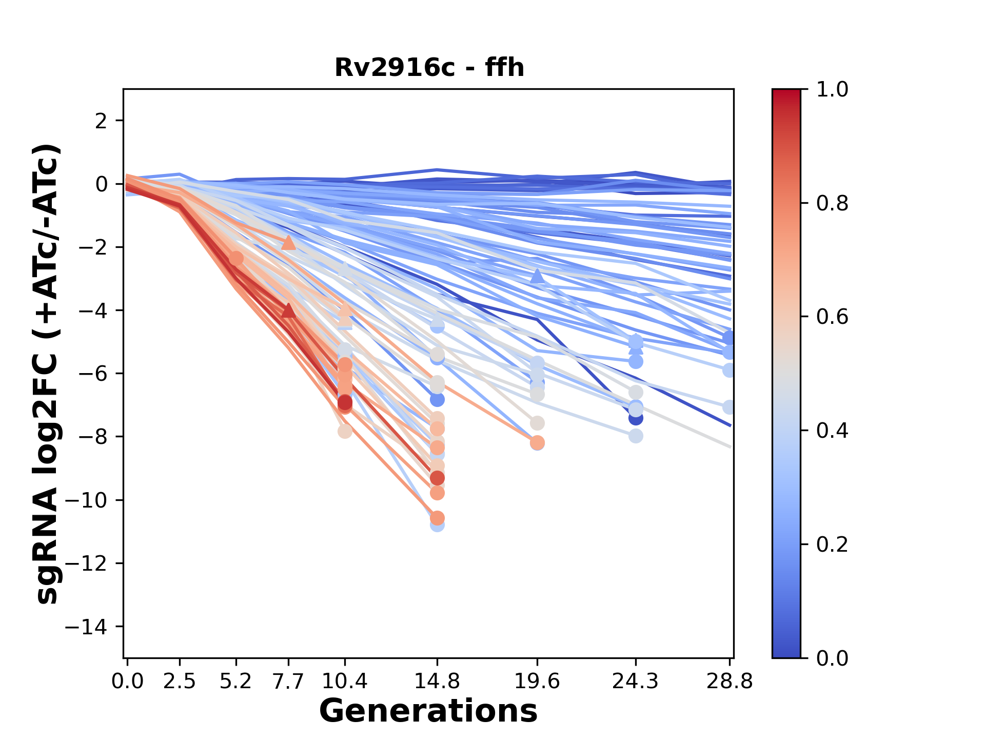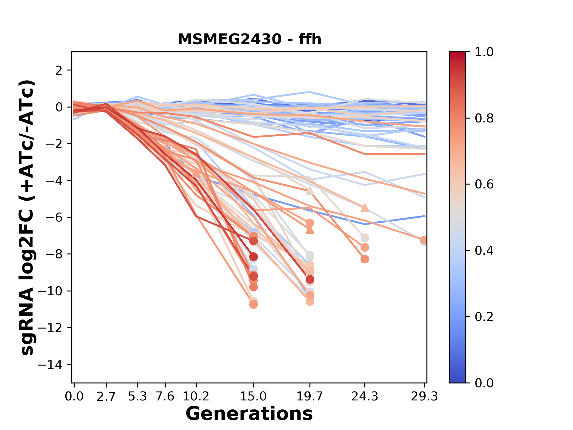Here, we show sgRNA log2 fold-change values (L2FC) (plus versus minus ATc) over consecutive generations for sgRNAs targeting the gene you selected.