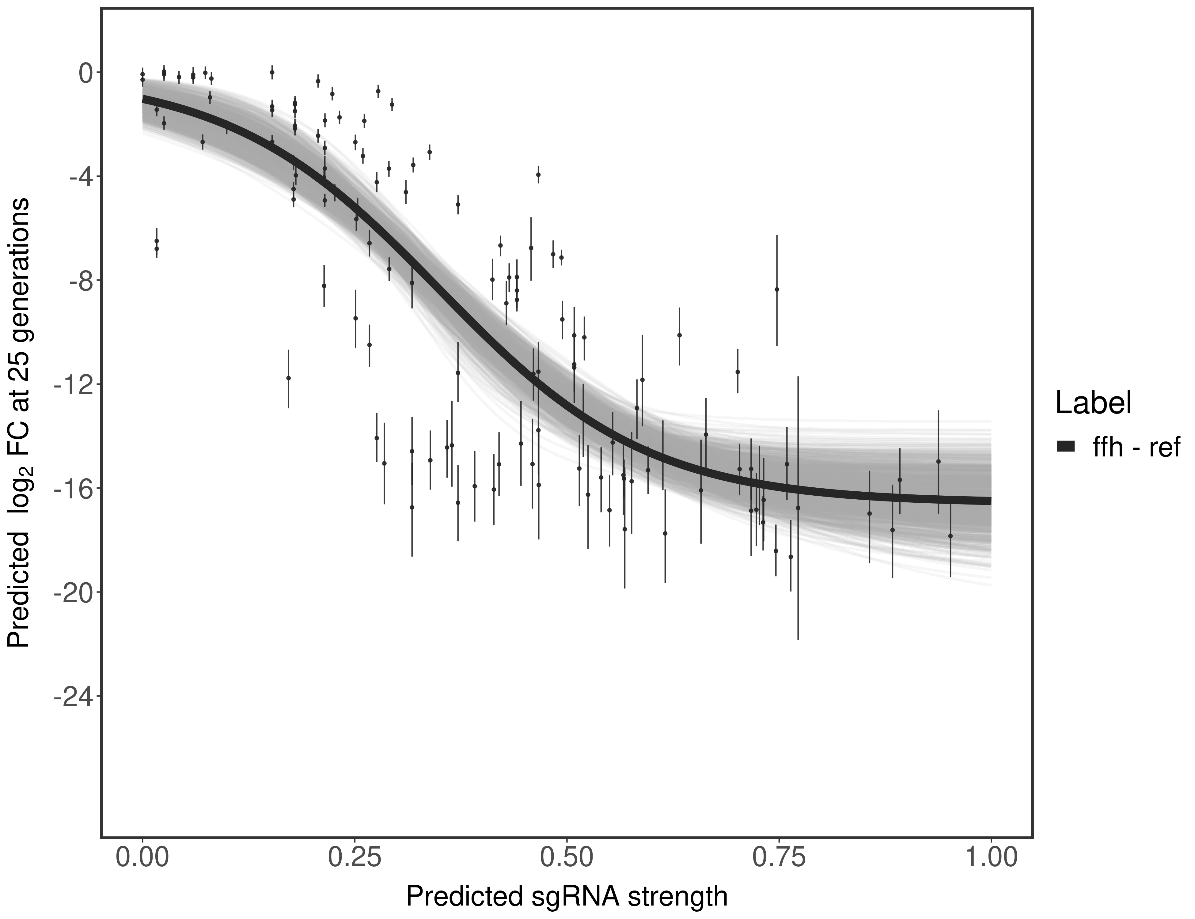 In order to quantify gene vulnerability, data were subsequently analyzed with a hierarchical model at the sgRNA level (two-line model) and gene level (Hill curve). The vulnerability quantification is shown below. [More information]