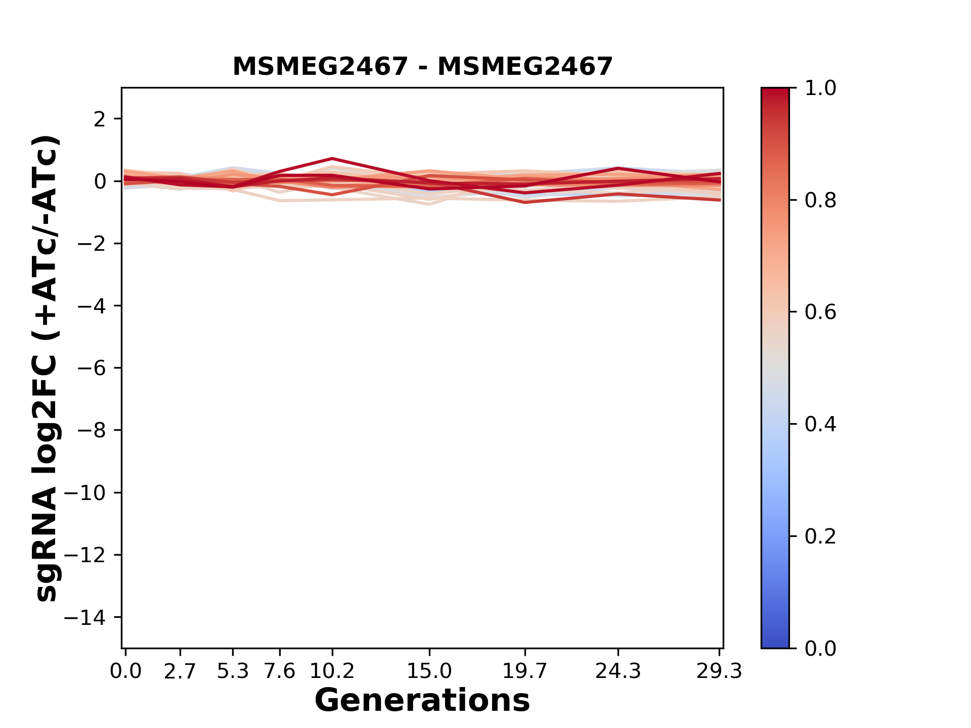 Here, we show sgRNA log2 fold-change values (L2FC) (plus versus minus ATc) over consecutive generations for sgRNAs targeting the gene you selected.