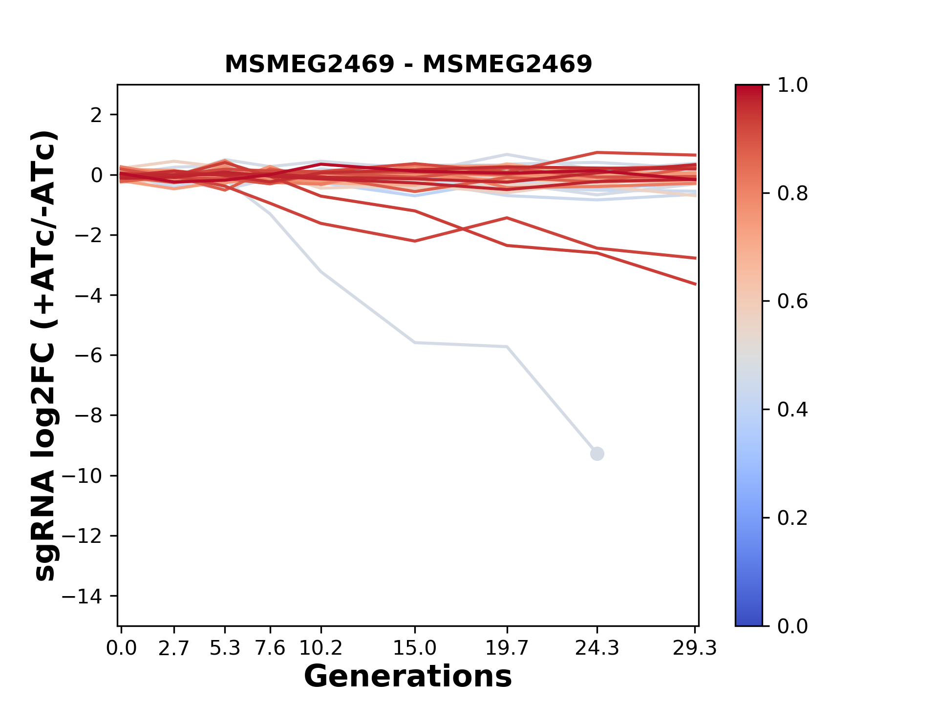 Here, we show sgRNA log2 fold-change values (L2FC) (plus versus minus ATc) over consecutive generations for sgRNAs targeting the gene you selected.
