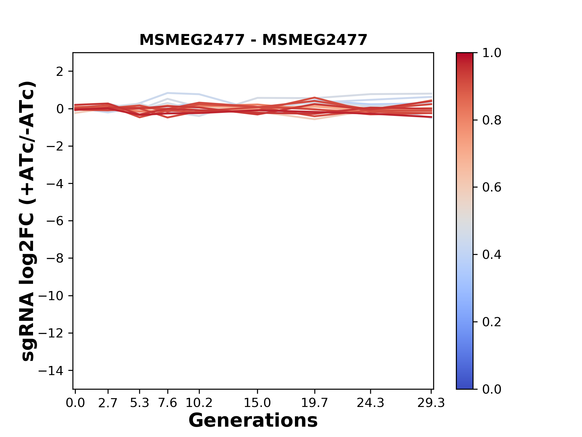 Here, we show sgRNA log2 fold-change values (L2FC) (plus versus minus ATc) over consecutive generations for sgRNAs targeting the gene you selected.