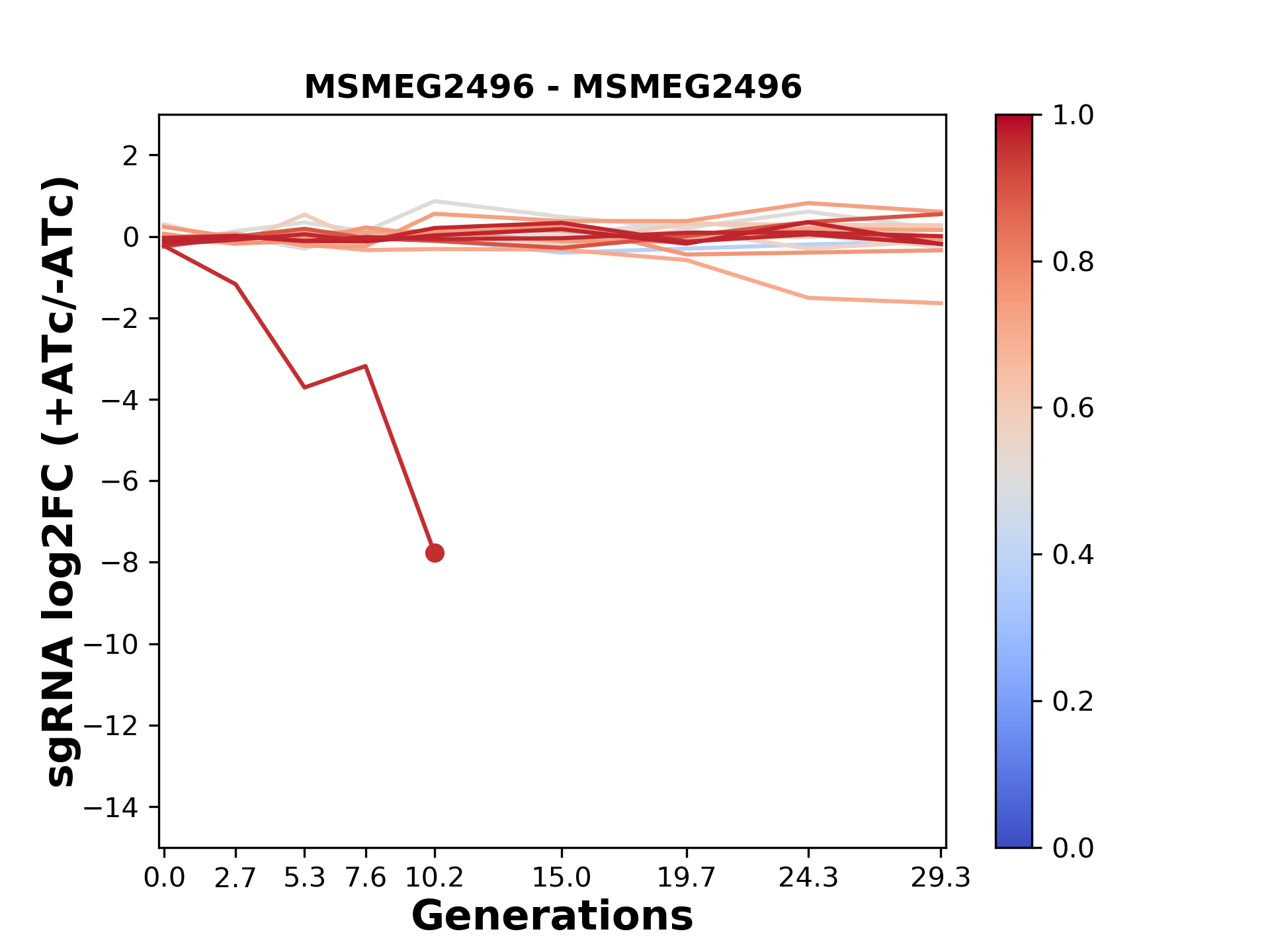 Here, we show sgRNA log2 fold-change values (L2FC) (plus versus minus ATc) over consecutive generations for sgRNAs targeting the gene you selected.