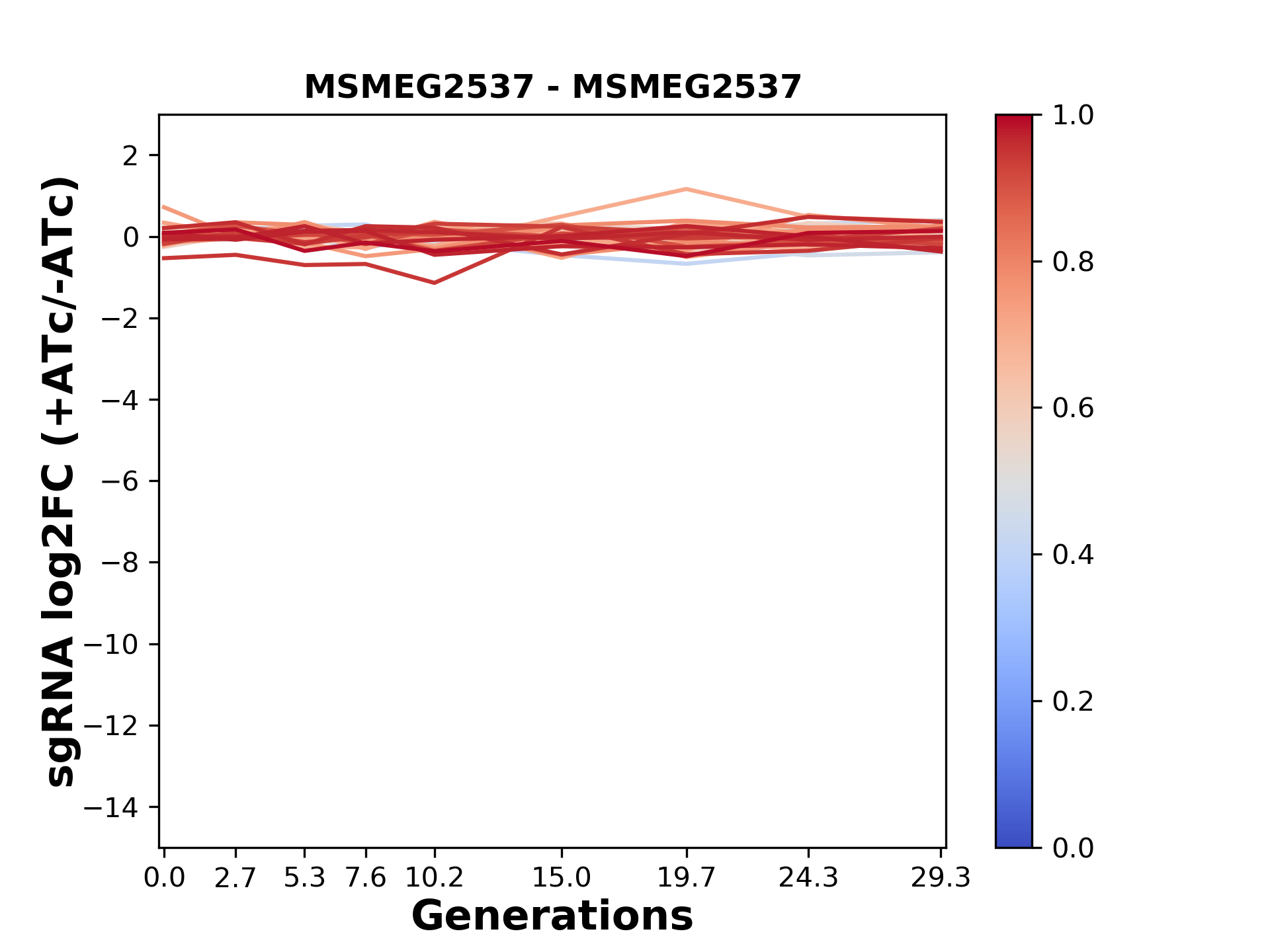 Here, we show sgRNA log2 fold-change values (L2FC) (plus versus minus ATc) over consecutive generations for sgRNAs targeting the gene you selected.