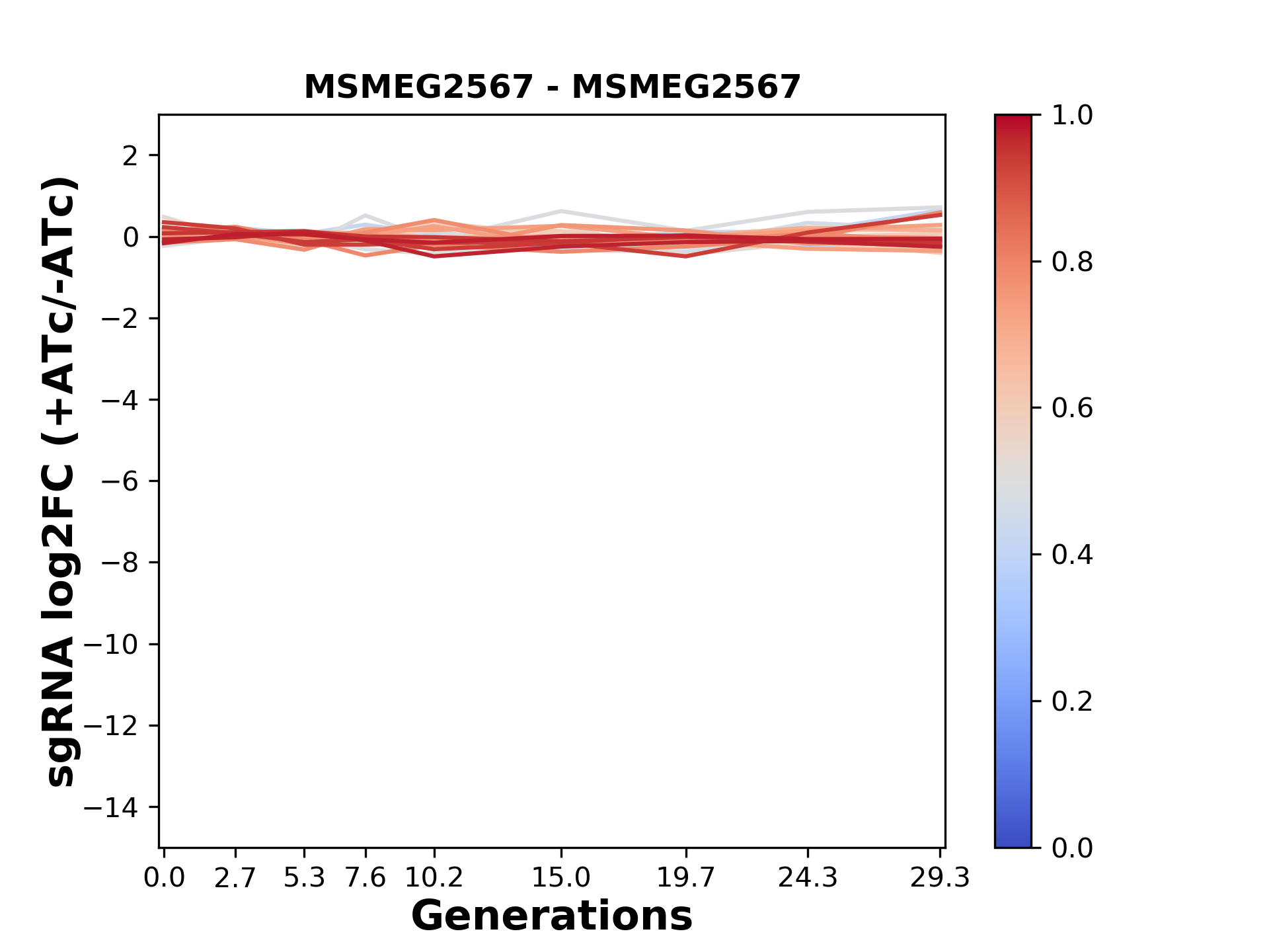 Here, we show sgRNA log2 fold-change values (L2FC) (plus versus minus ATc) over consecutive generations for sgRNAs targeting the gene you selected.