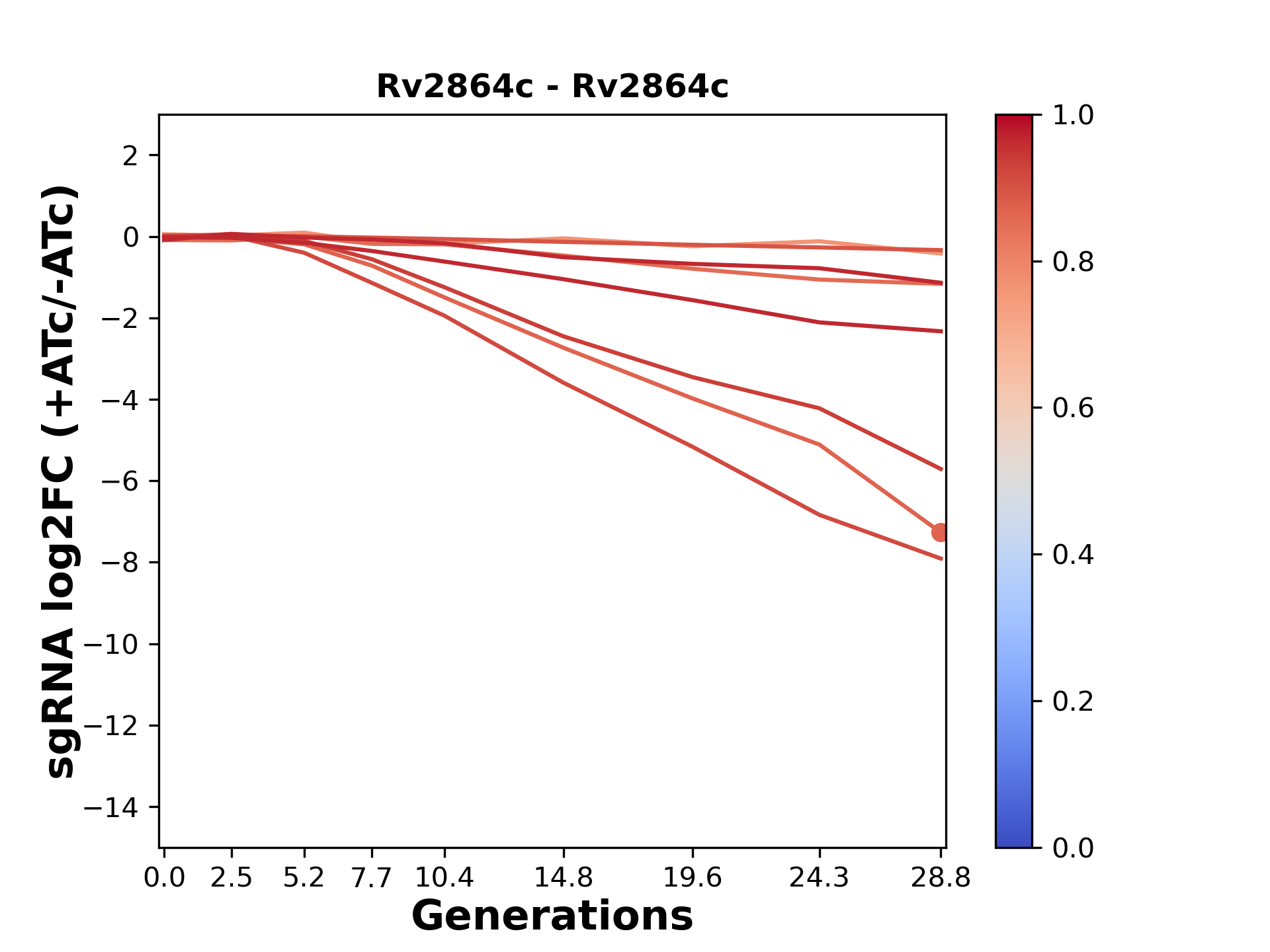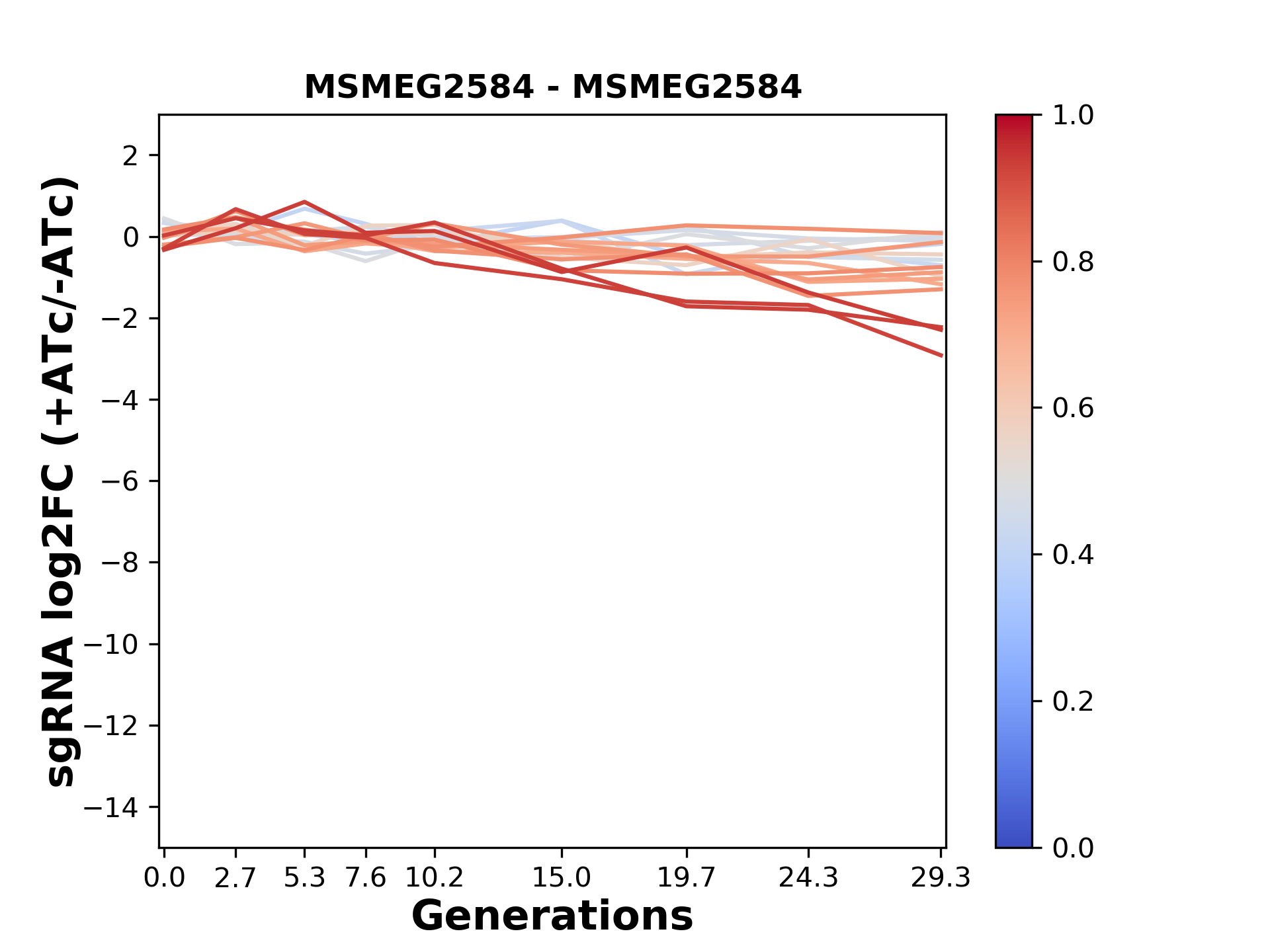 Here, we show sgRNA log2 fold-change values (L2FC) (plus versus minus ATc) over consecutive generations for sgRNAs targeting the gene you selected.