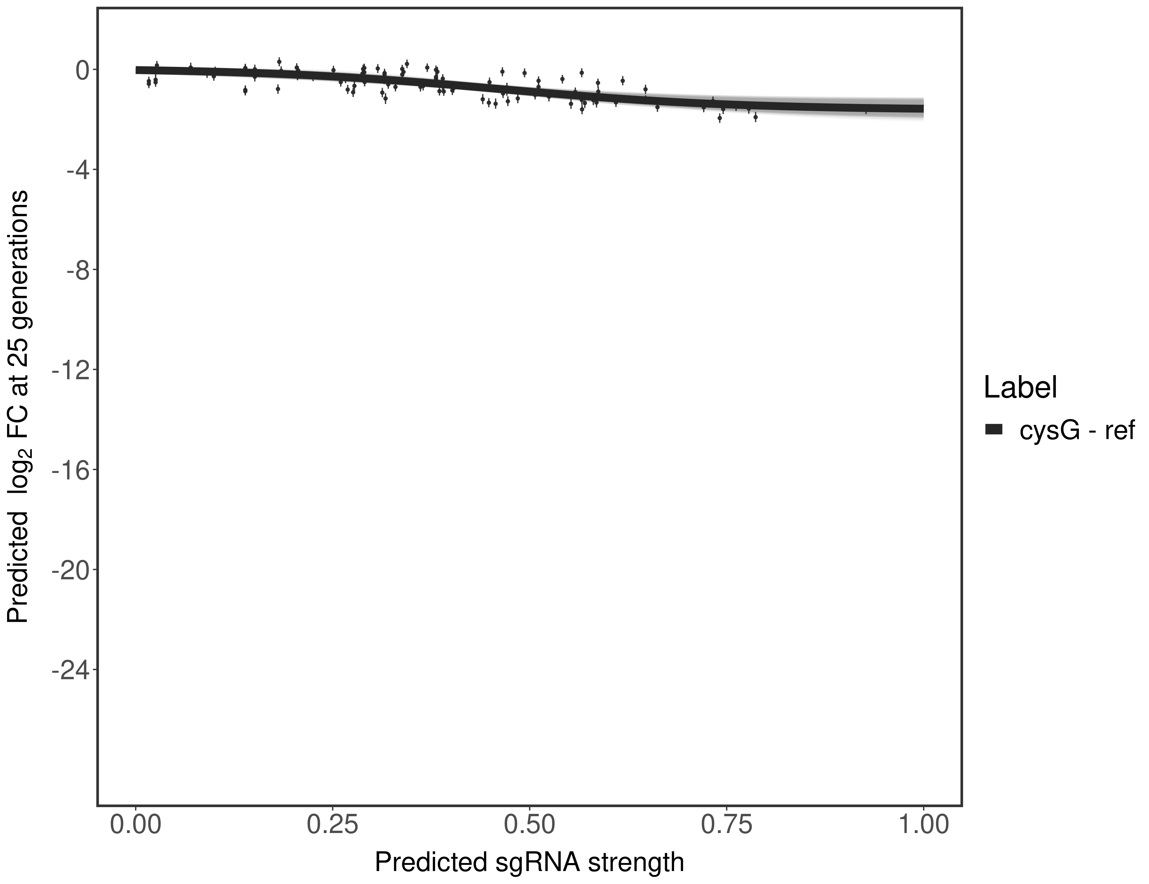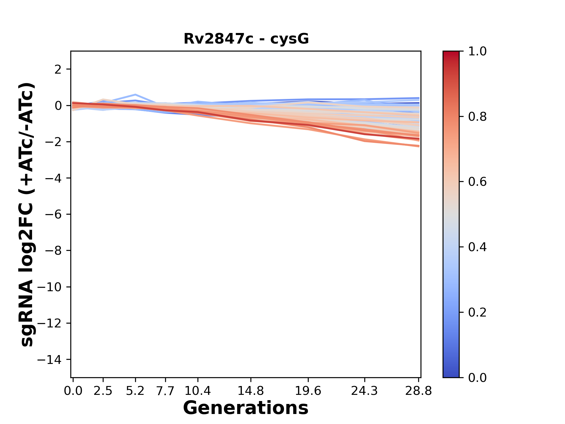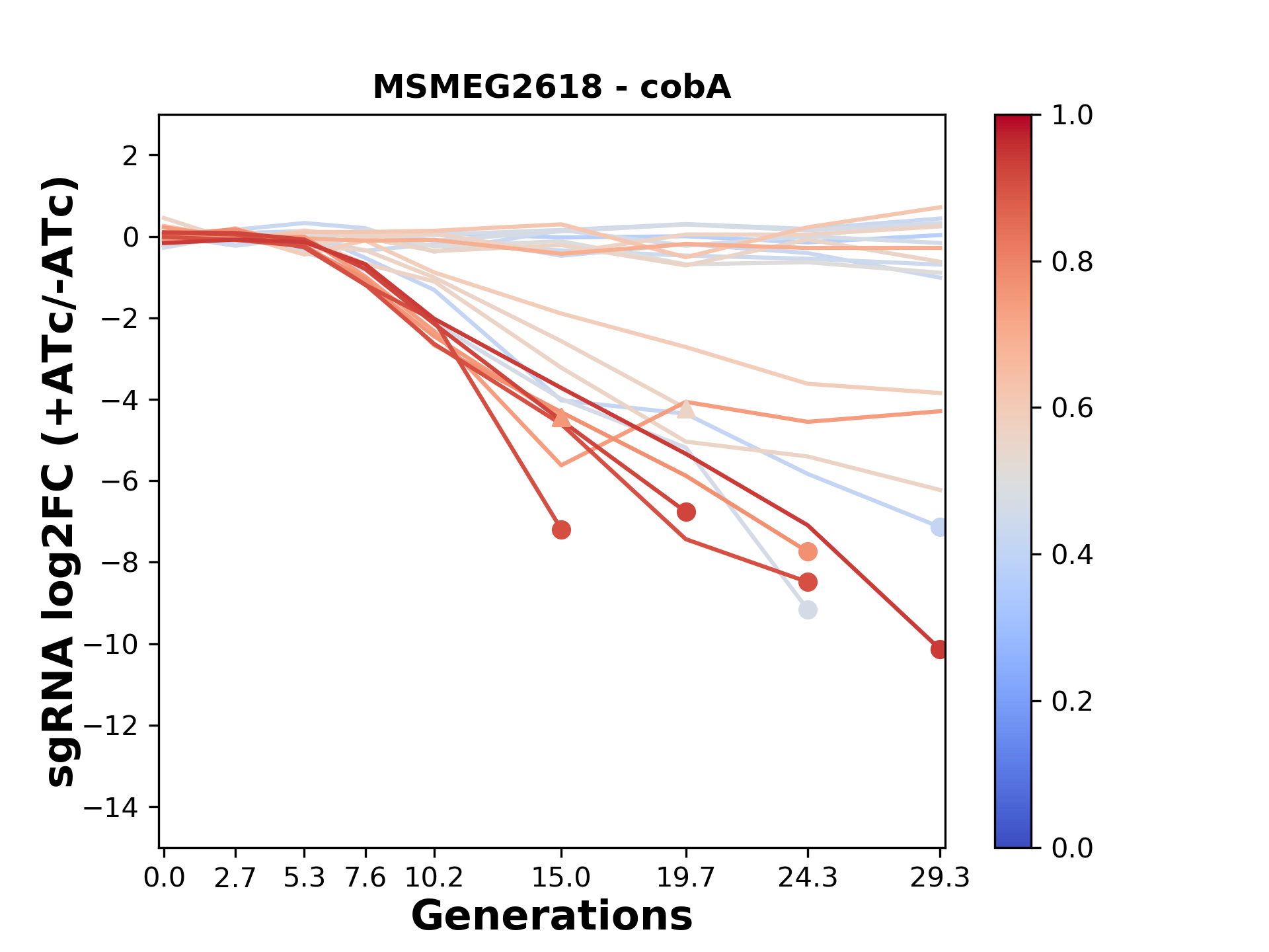 Here, we show sgRNA log2 fold-change values (L2FC) (plus versus minus ATc) over consecutive generations for sgRNAs targeting the gene you selected.