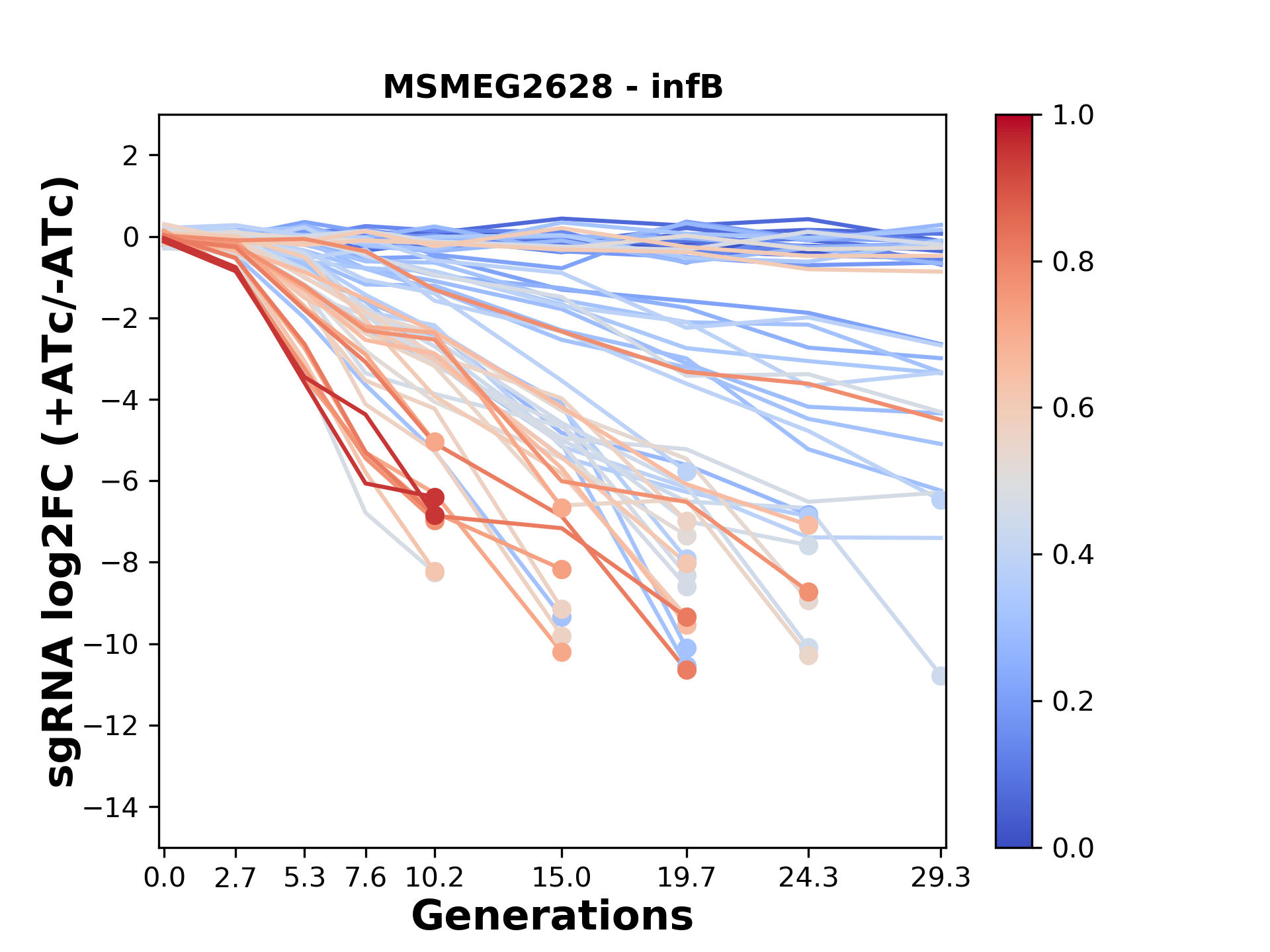 Here, we show sgRNA log2 fold-change values (L2FC) (plus versus minus ATc) over consecutive generations for sgRNAs targeting the gene you selected.