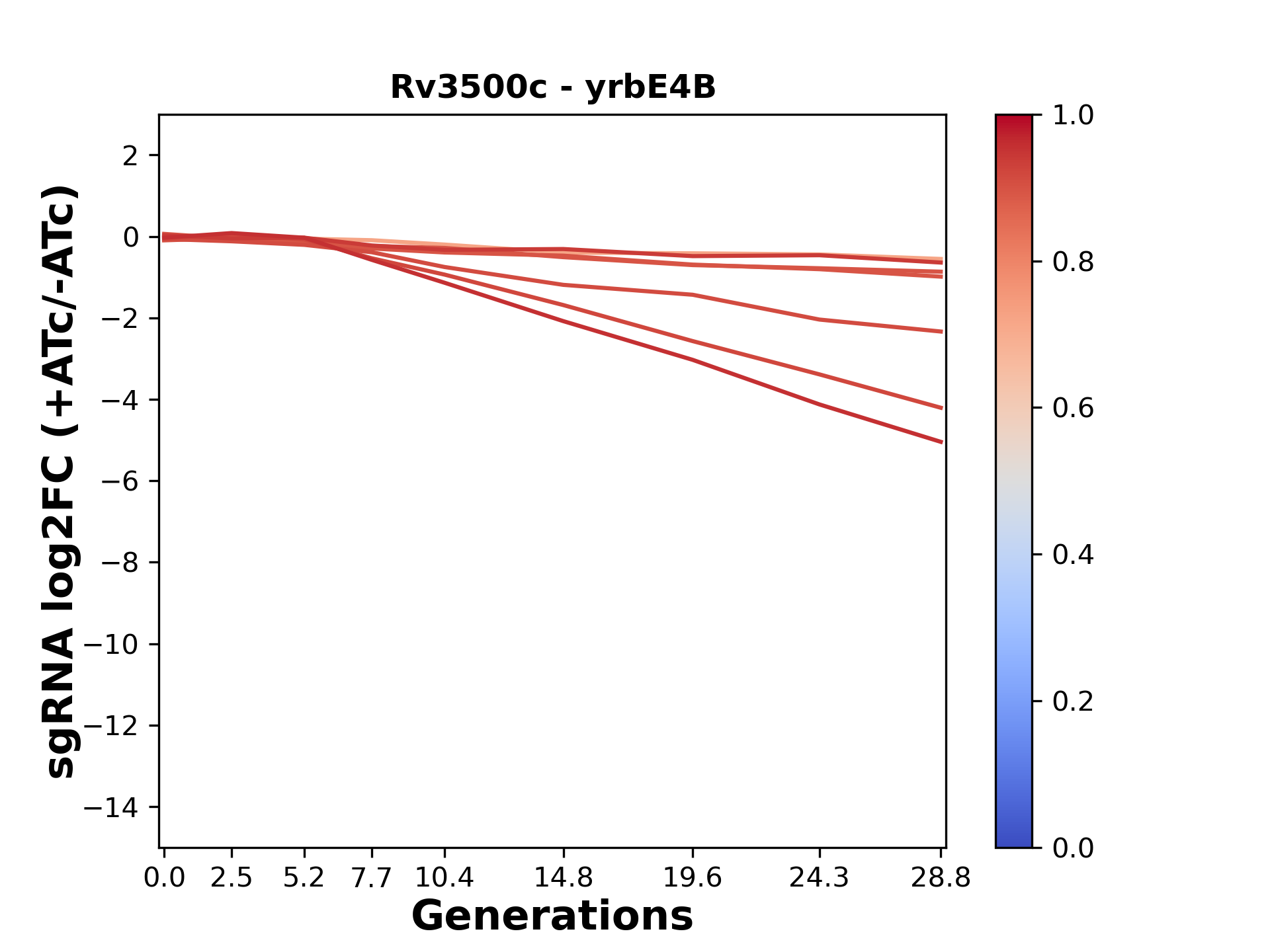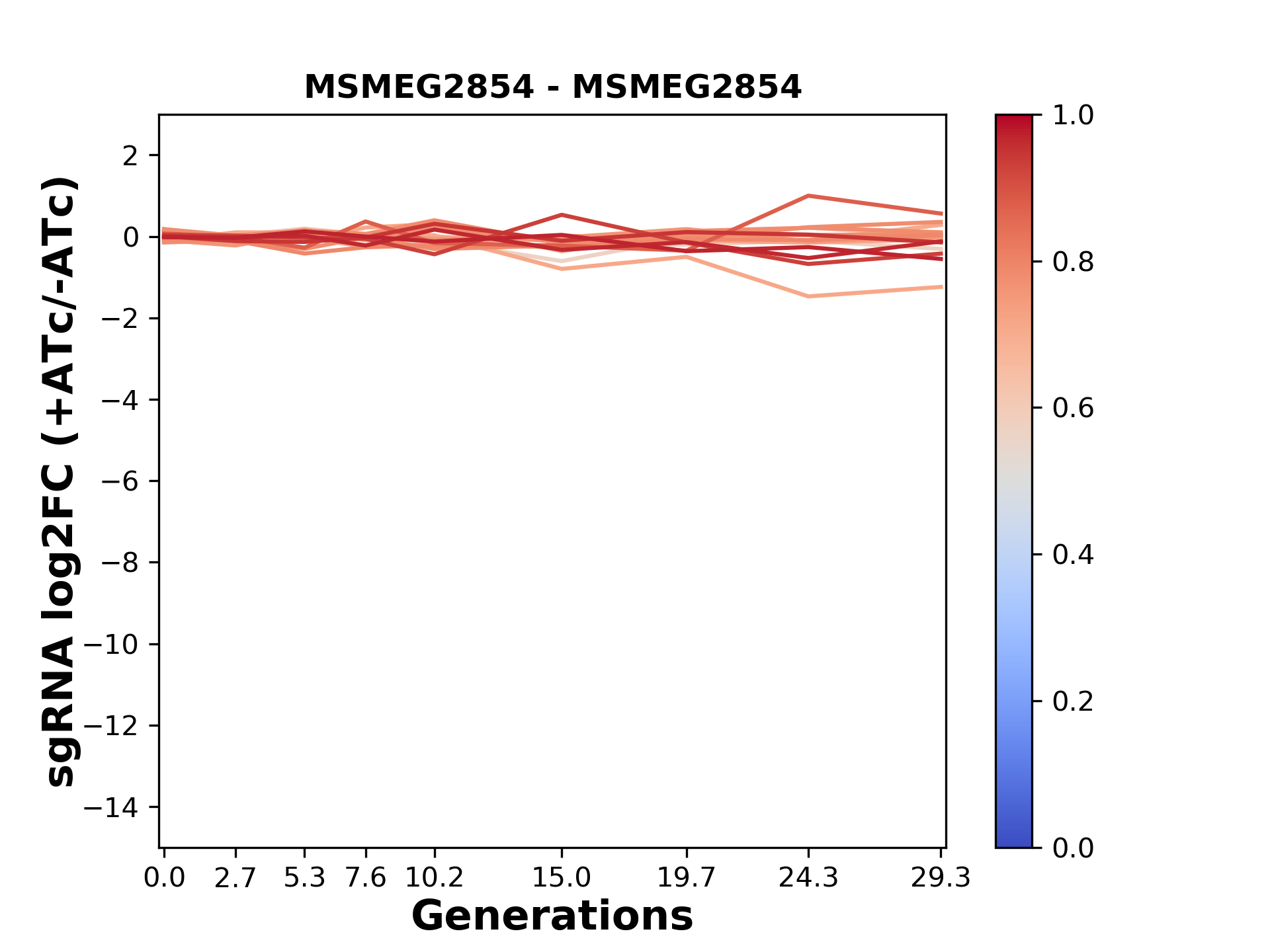 Here, we show sgRNA log2 fold-change values (L2FC) (plus versus minus ATc) over consecutive generations for sgRNAs targeting the gene you selected.