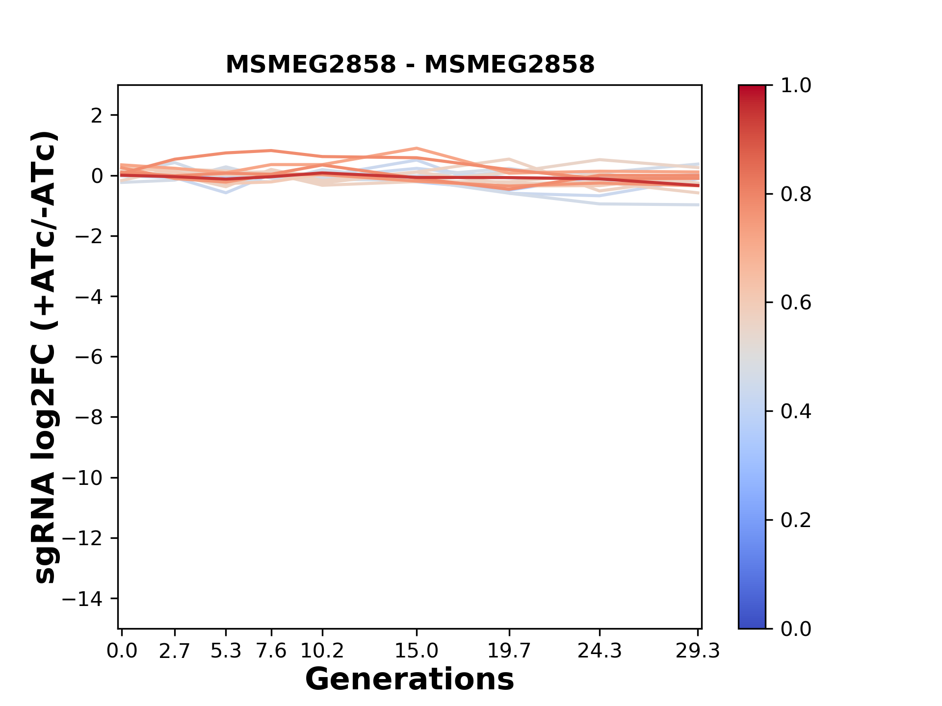 Here, we show sgRNA log2 fold-change values (L2FC) (plus versus minus ATc) over consecutive generations for sgRNAs targeting the gene you selected.