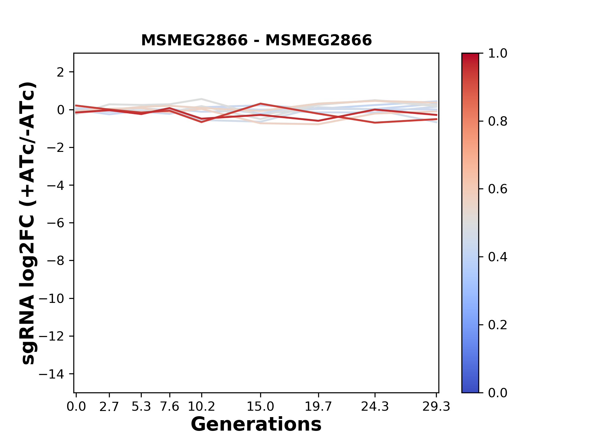 Here, we show sgRNA log2 fold-change values (L2FC) (plus versus minus ATc) over consecutive generations for sgRNAs targeting the gene you selected.