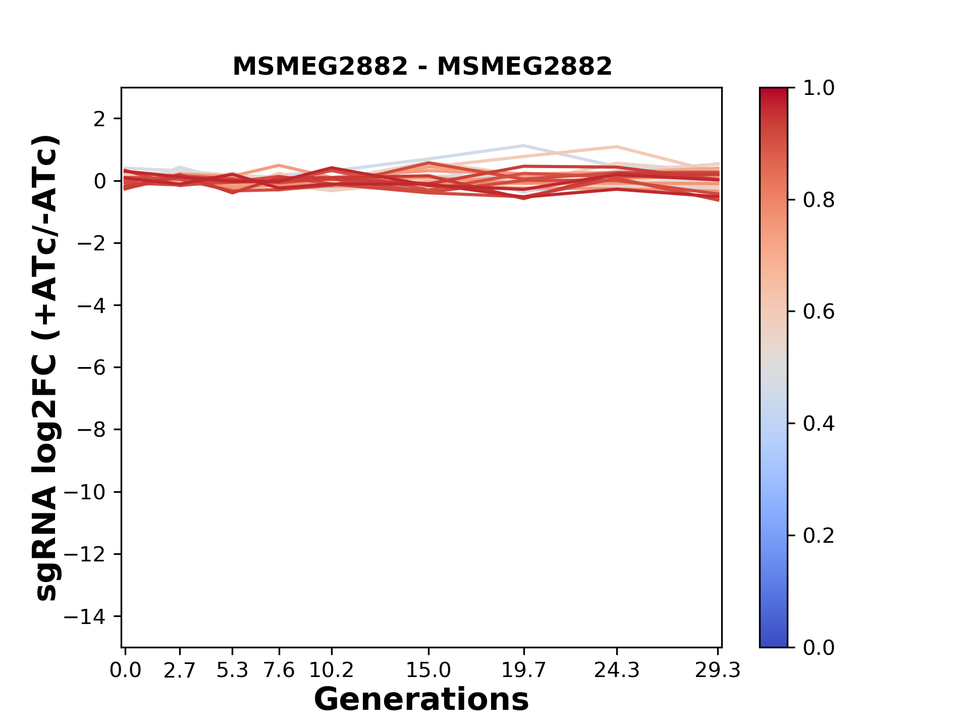 Here, we show sgRNA log2 fold-change values (L2FC) (plus versus minus ATc) over consecutive generations for sgRNAs targeting the gene you selected.