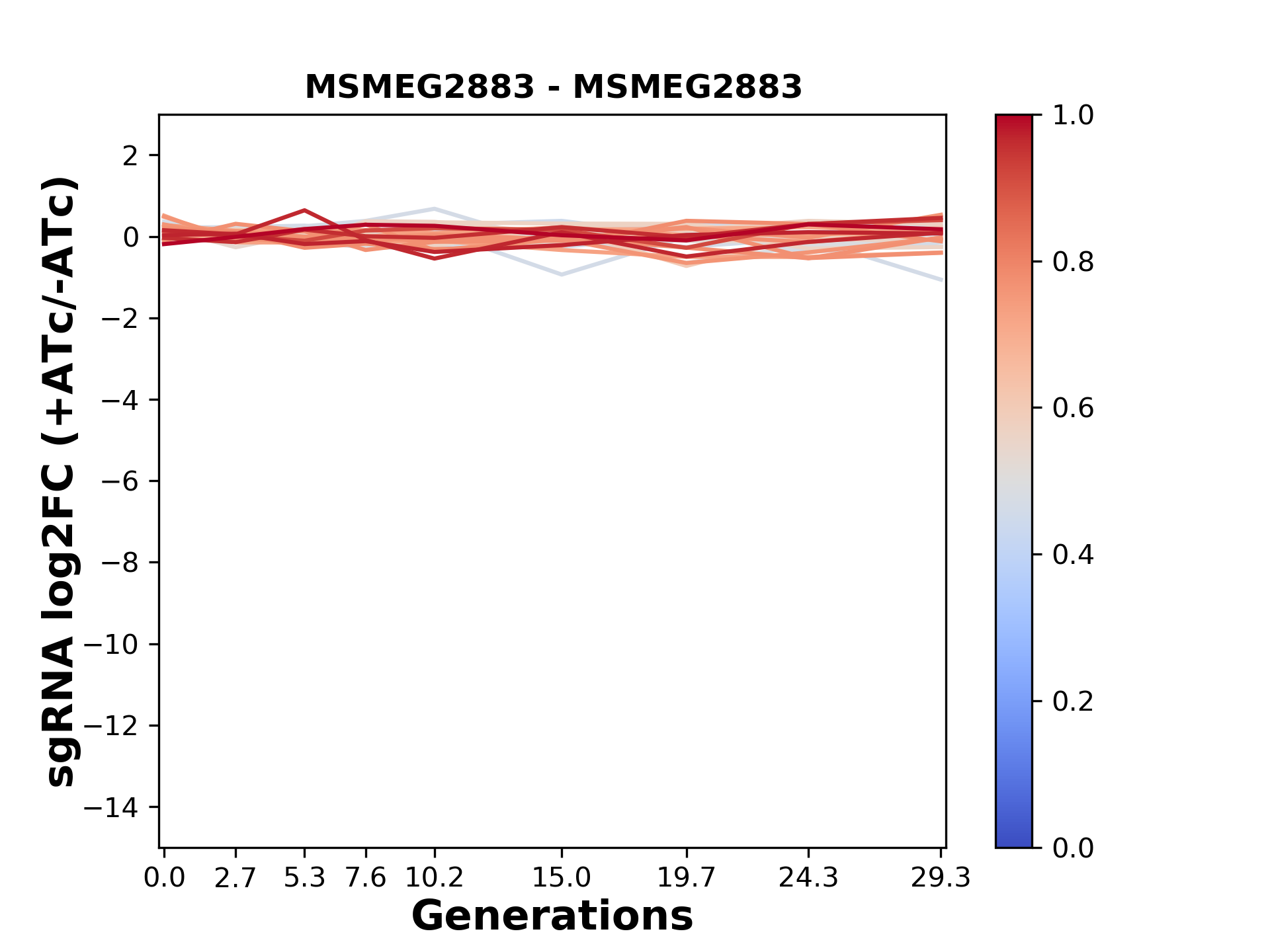 Here, we show sgRNA log2 fold-change values (L2FC) (plus versus minus ATc) over consecutive generations for sgRNAs targeting the gene you selected.