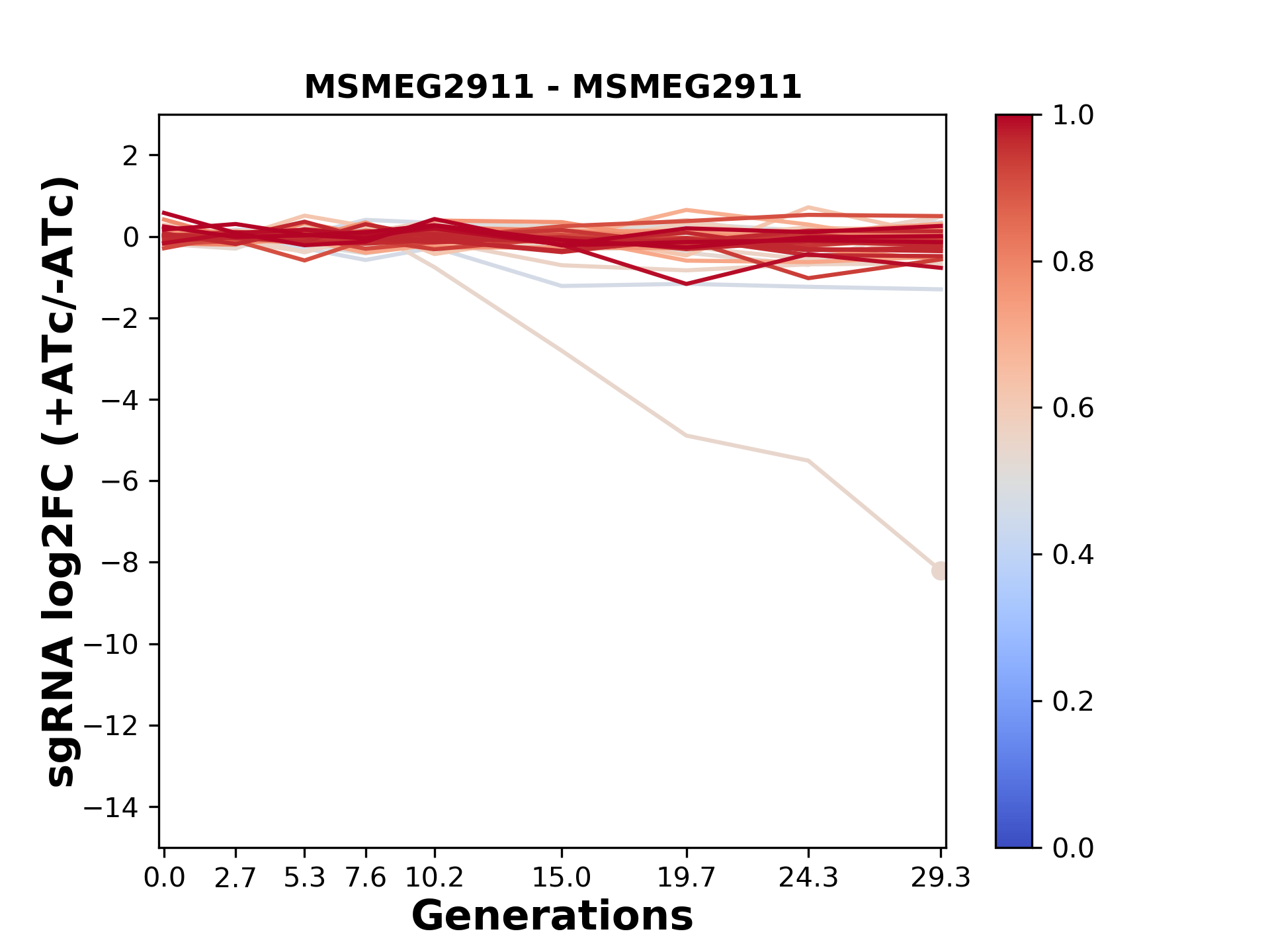 Here, we show sgRNA log2 fold-change values (L2FC) (plus versus minus ATc) over consecutive generations for sgRNAs targeting the gene you selected.