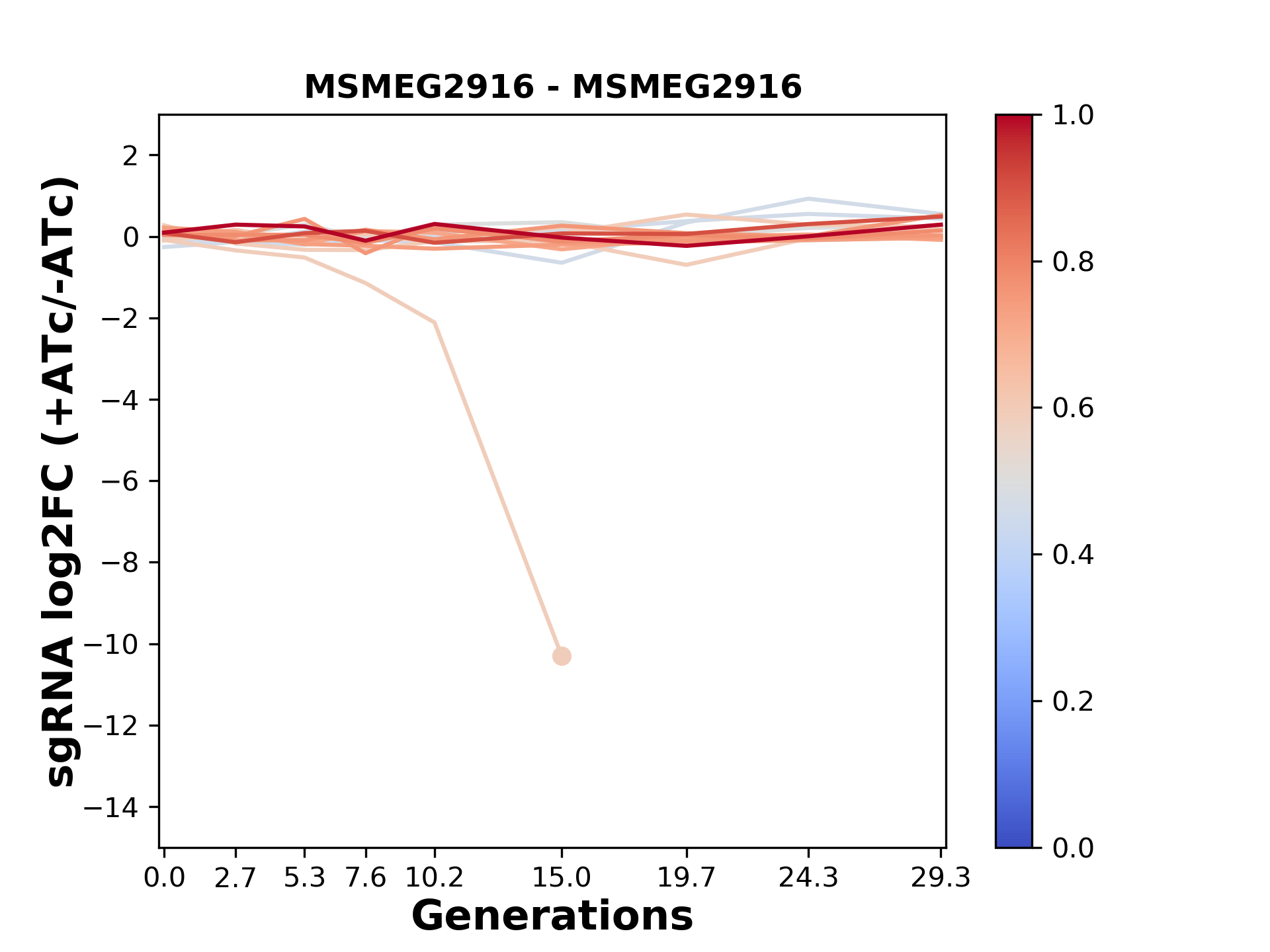 Here, we show sgRNA log2 fold-change values (L2FC) (plus versus minus ATc) over consecutive generations for sgRNAs targeting the gene you selected.