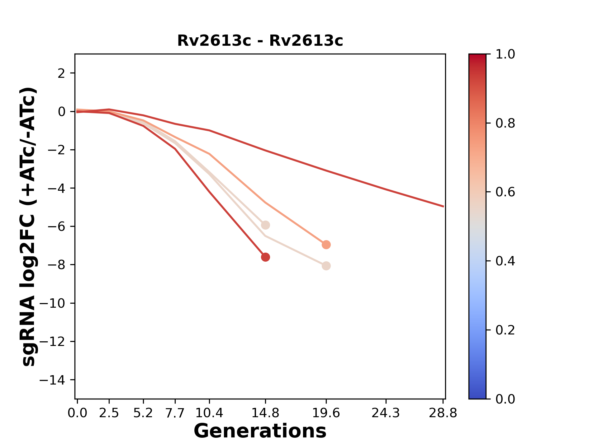 Here, we show sgRNA log2 fold-change values (L2FC) (plus versus minus ATc) over consecutive generations for sgRNAs targeting the gene you selected.