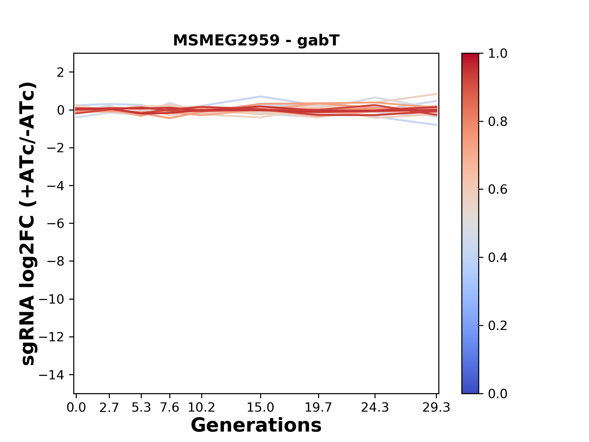 Here, we show sgRNA log2 fold-change values (L2FC) (plus versus minus ATc) over consecutive generations for sgRNAs targeting the gene you selected.