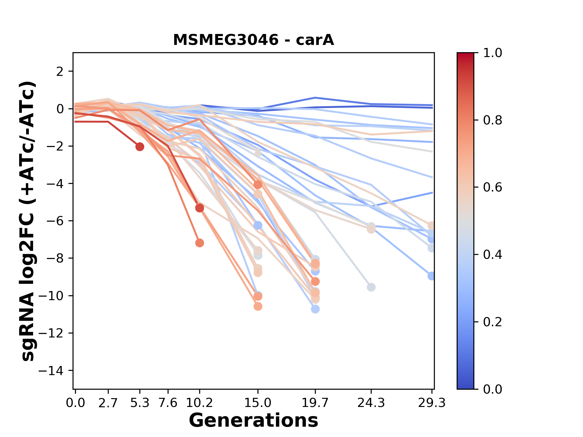 Here, we show sgRNA log2 fold-change values (L2FC) (plus versus minus ATc) over consecutive generations for sgRNAs targeting the gene you selected.