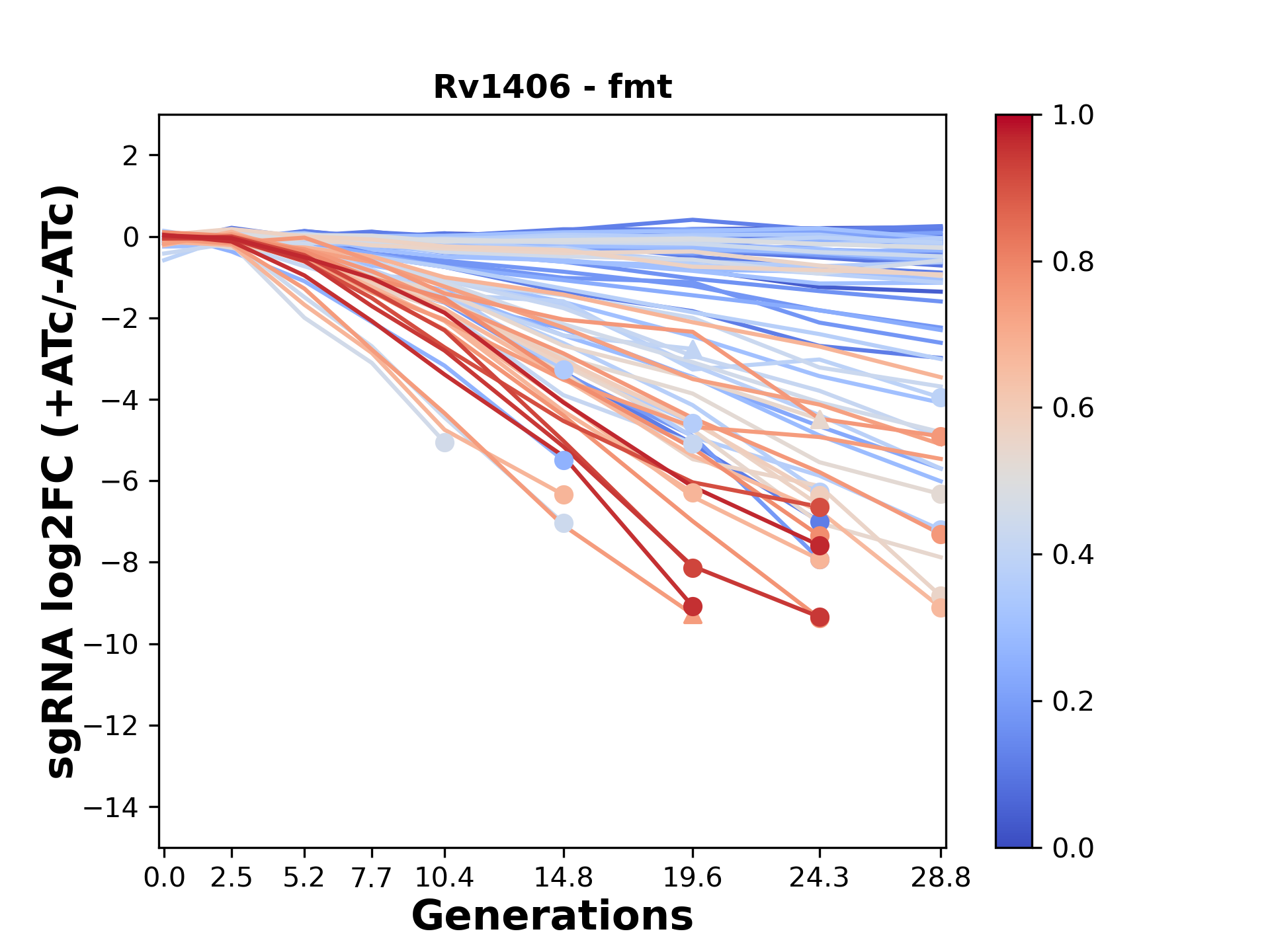 Here, we show sgRNA log2 fold-change values (L2FC) (plus versus minus ATc) over consecutive generations for sgRNAs targeting the gene you selected.