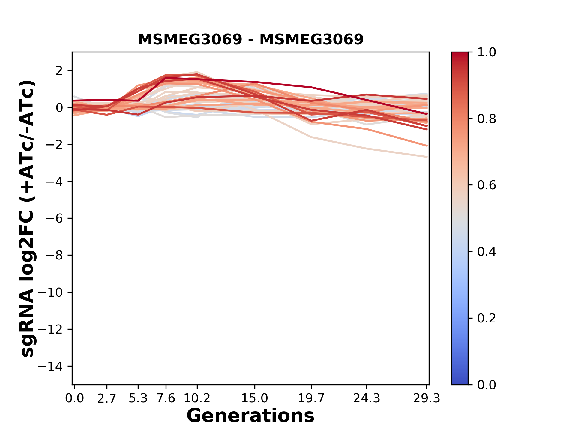 Here, we show sgRNA log2 fold-change values (L2FC) (plus versus minus ATc) over consecutive generations for sgRNAs targeting the gene you selected.