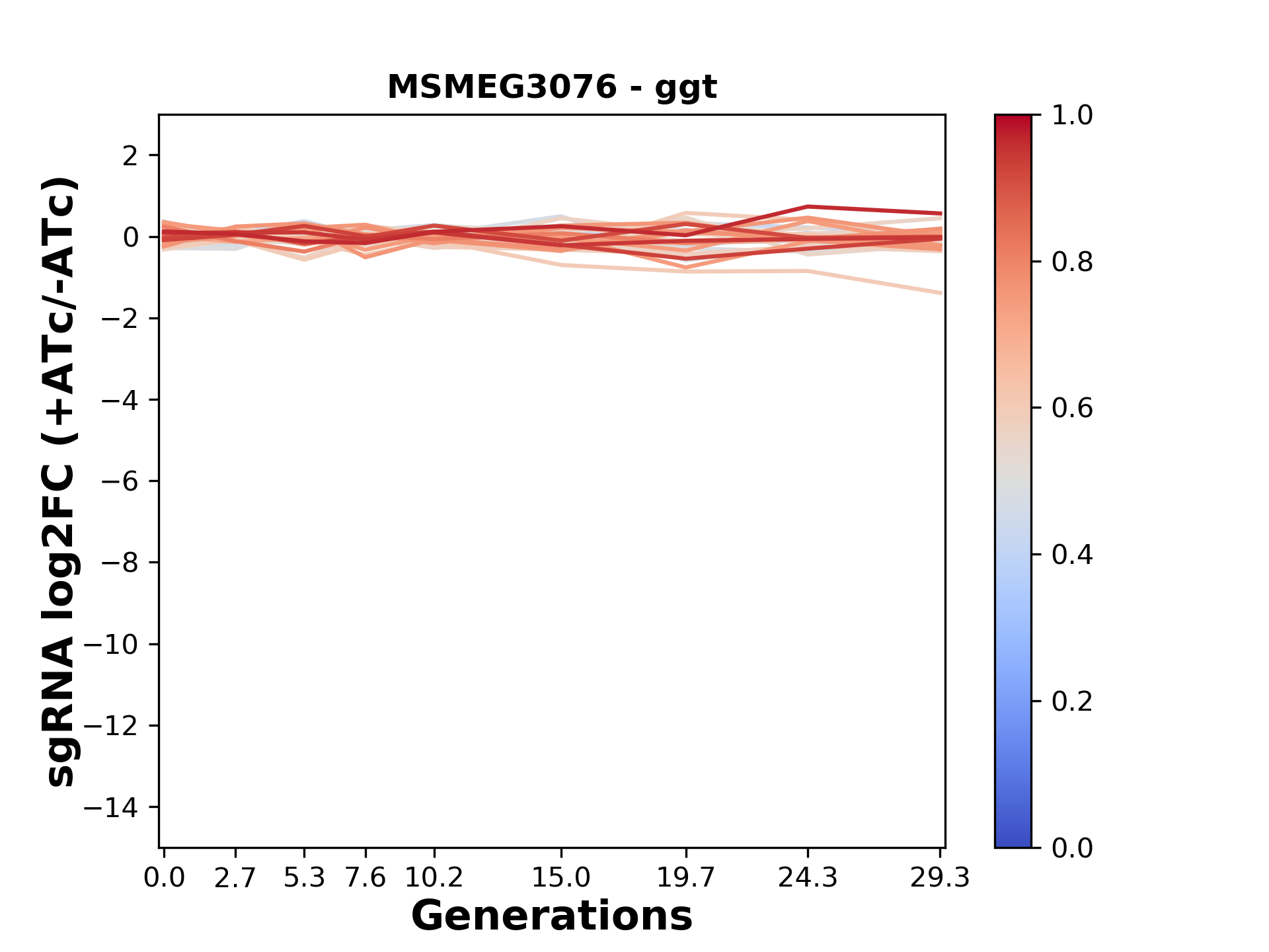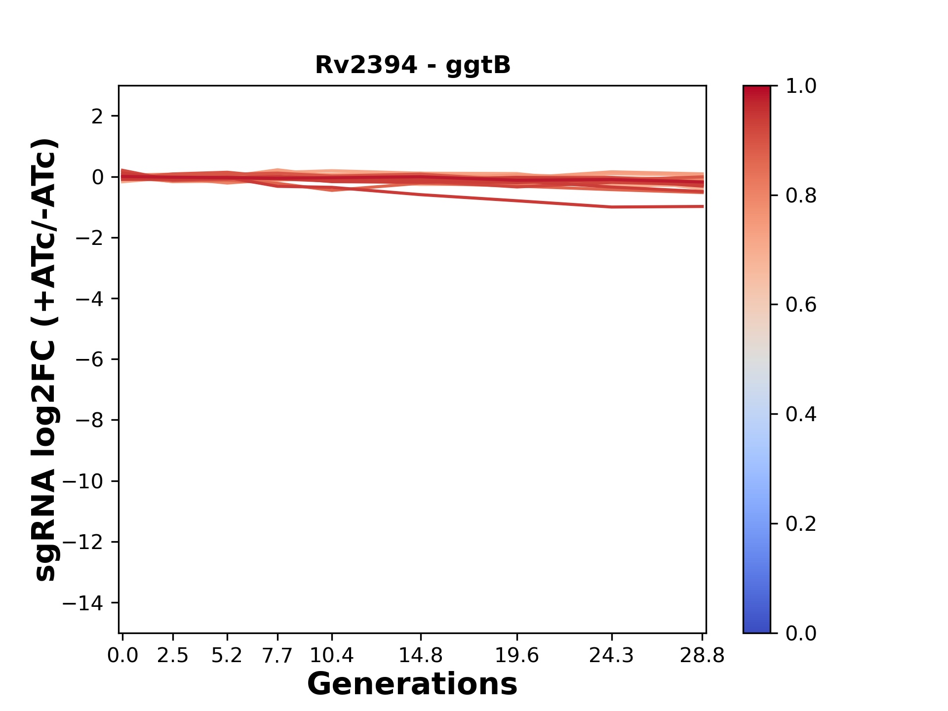 Here, we show sgRNA log2 fold-change values (L2FC) (plus versus minus ATc) over consecutive generations for sgRNAs targeting the gene you selected.