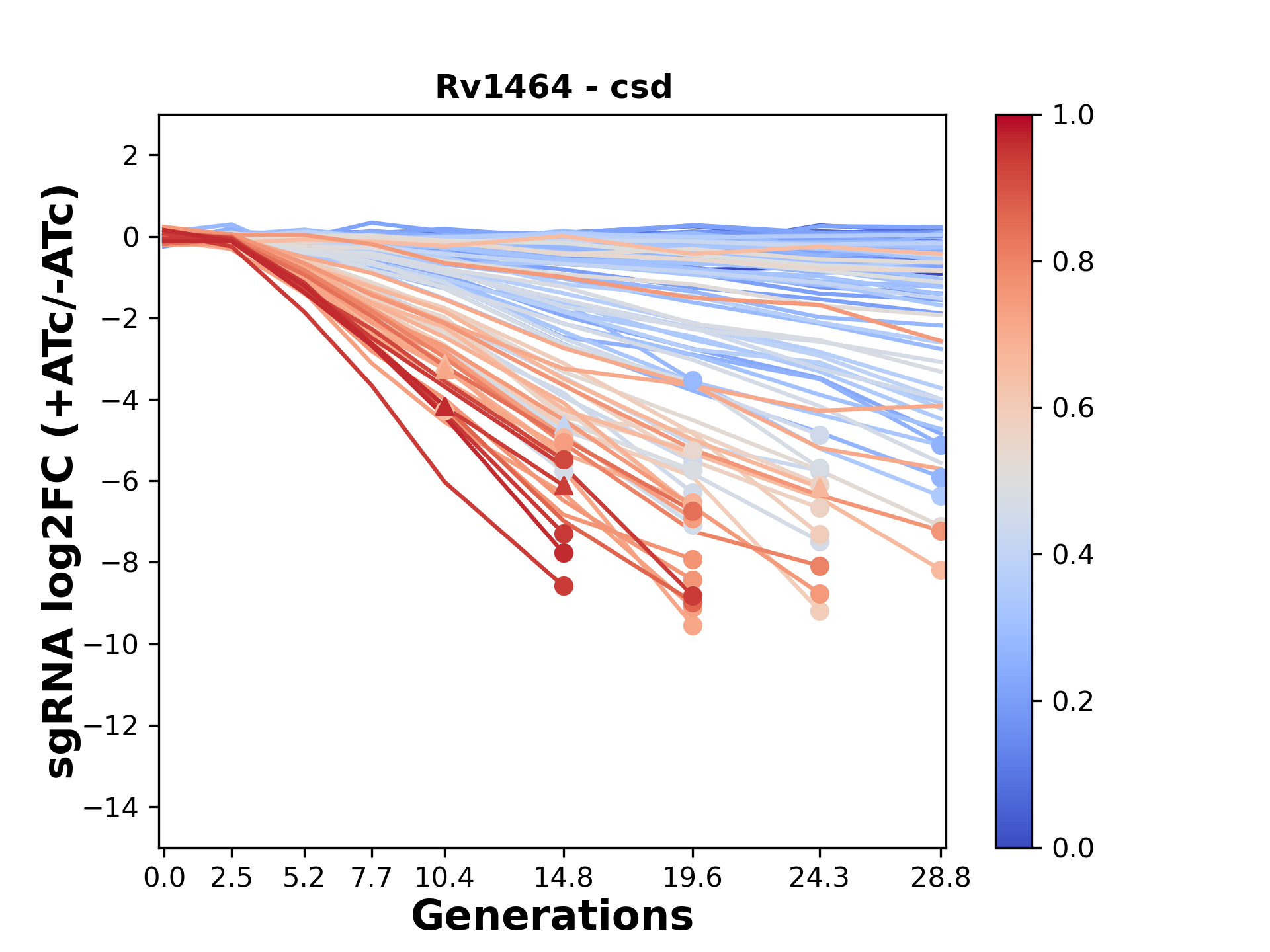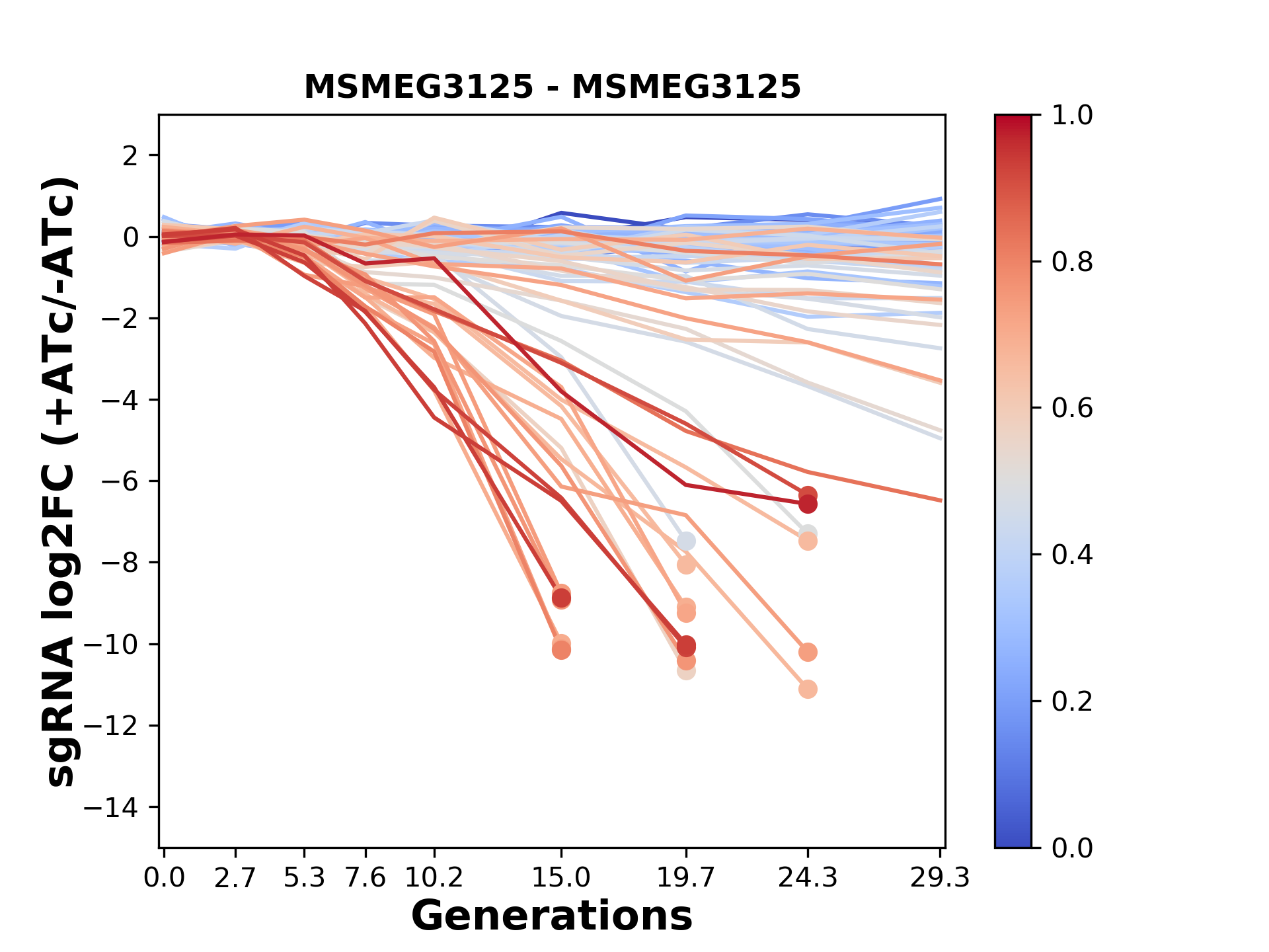 Here, we show sgRNA log2 fold-change values (L2FC) (plus versus minus ATc) over consecutive generations for sgRNAs targeting the gene you selected.