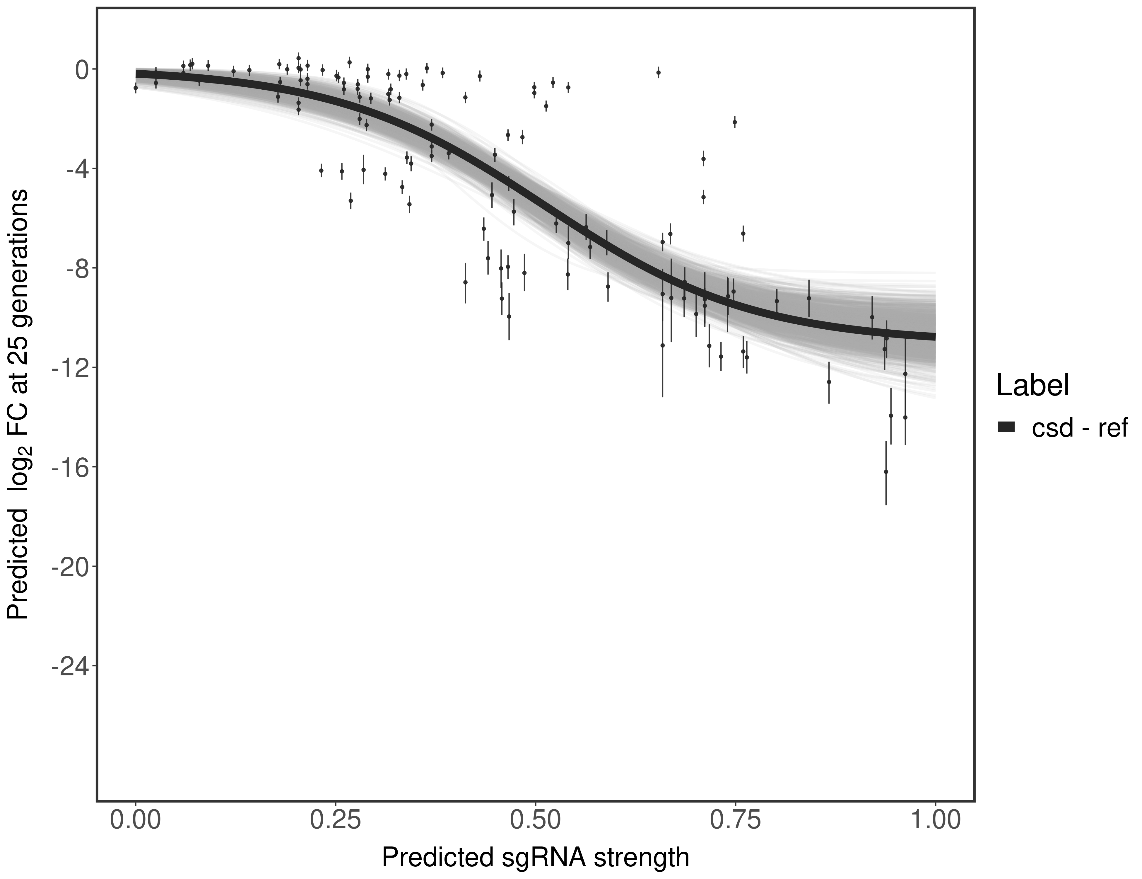 In order to quantify gene vulnerability, data were subsequently analyzed with a hierarchical model at the sgRNA level (two-line model) and gene level (Hill curve). The vulnerability quantification is shown below. [More information]