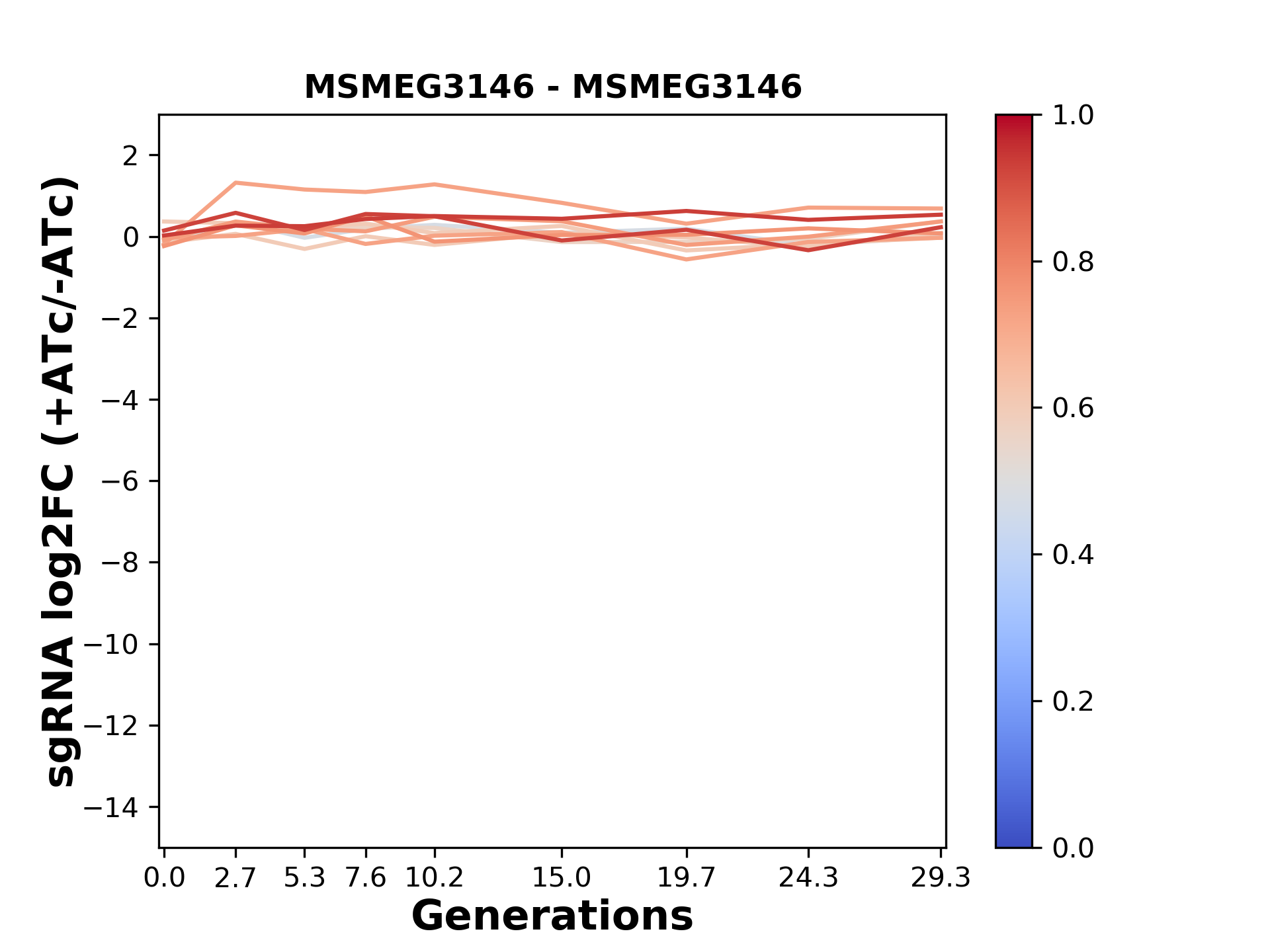 Here, we show sgRNA log2 fold-change values (L2FC) (plus versus minus ATc) over consecutive generations for sgRNAs targeting the gene you selected.