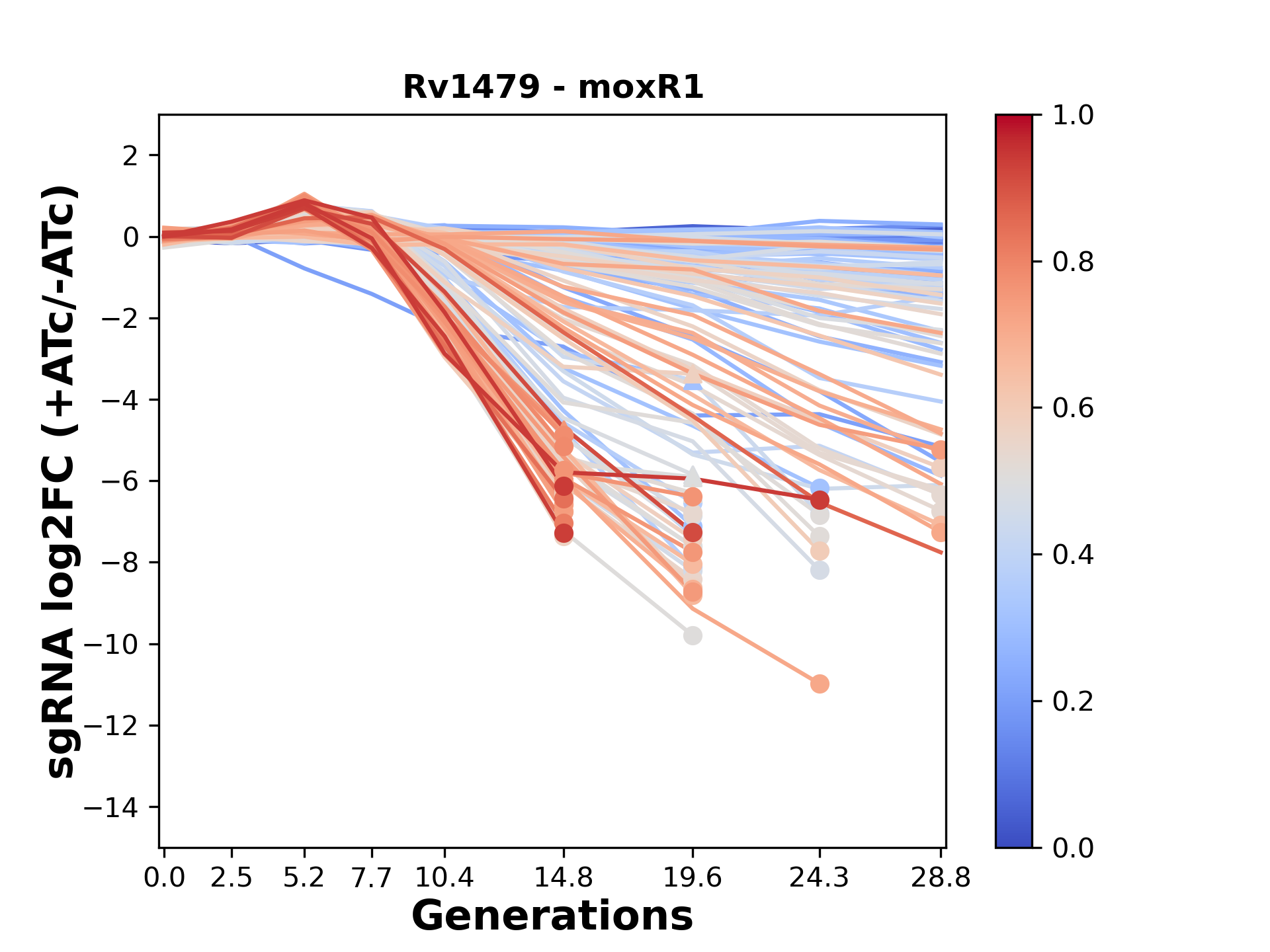 Here, we show sgRNA log2 fold-change values (L2FC) (plus versus minus ATc) over consecutive generations for sgRNAs targeting the gene you selected.