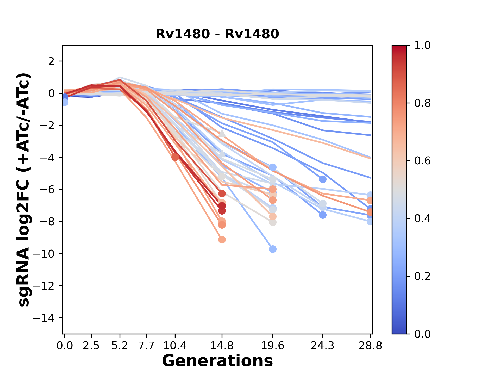 Experiment: We designed an M. tuberculosis CRISPRi library (RLC12) to target all annotated Mtb genes with single guide RNAs (sgRNAs) of varying predicted knockdown efficiencies.