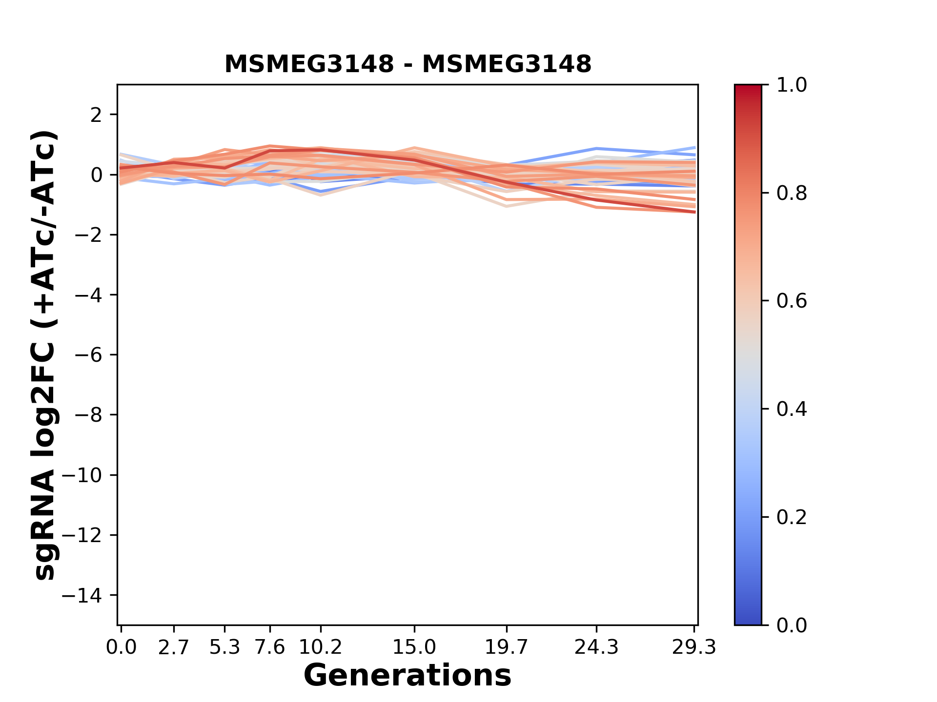 Here, we show sgRNA log2 fold-change values (L2FC) (plus versus minus ATc) over consecutive generations for sgRNAs targeting the gene you selected.