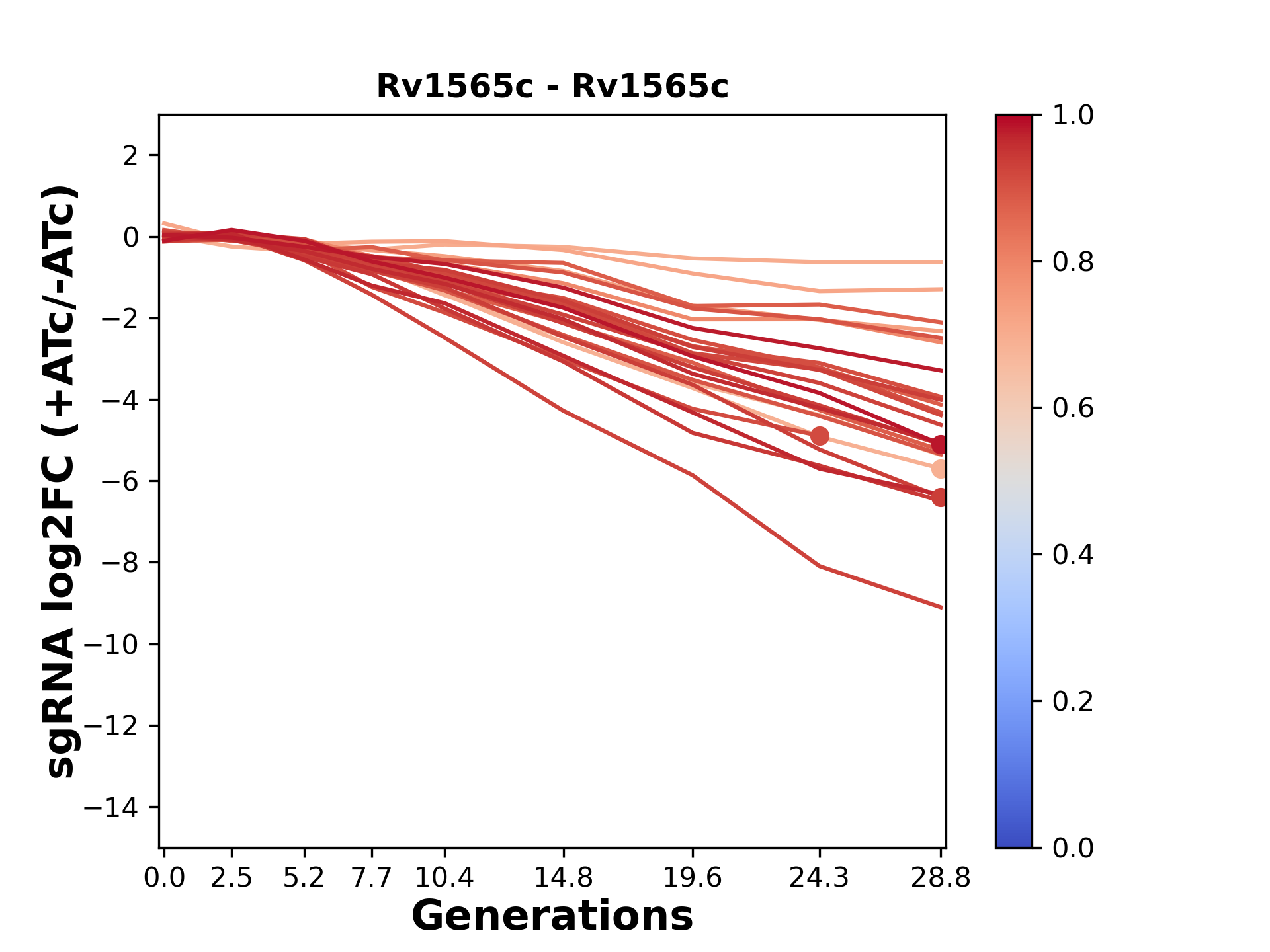 Here, we show sgRNA log2 fold-change values (L2FC) (plus versus minus ATc) over consecutive generations for sgRNAs targeting the gene you selected.