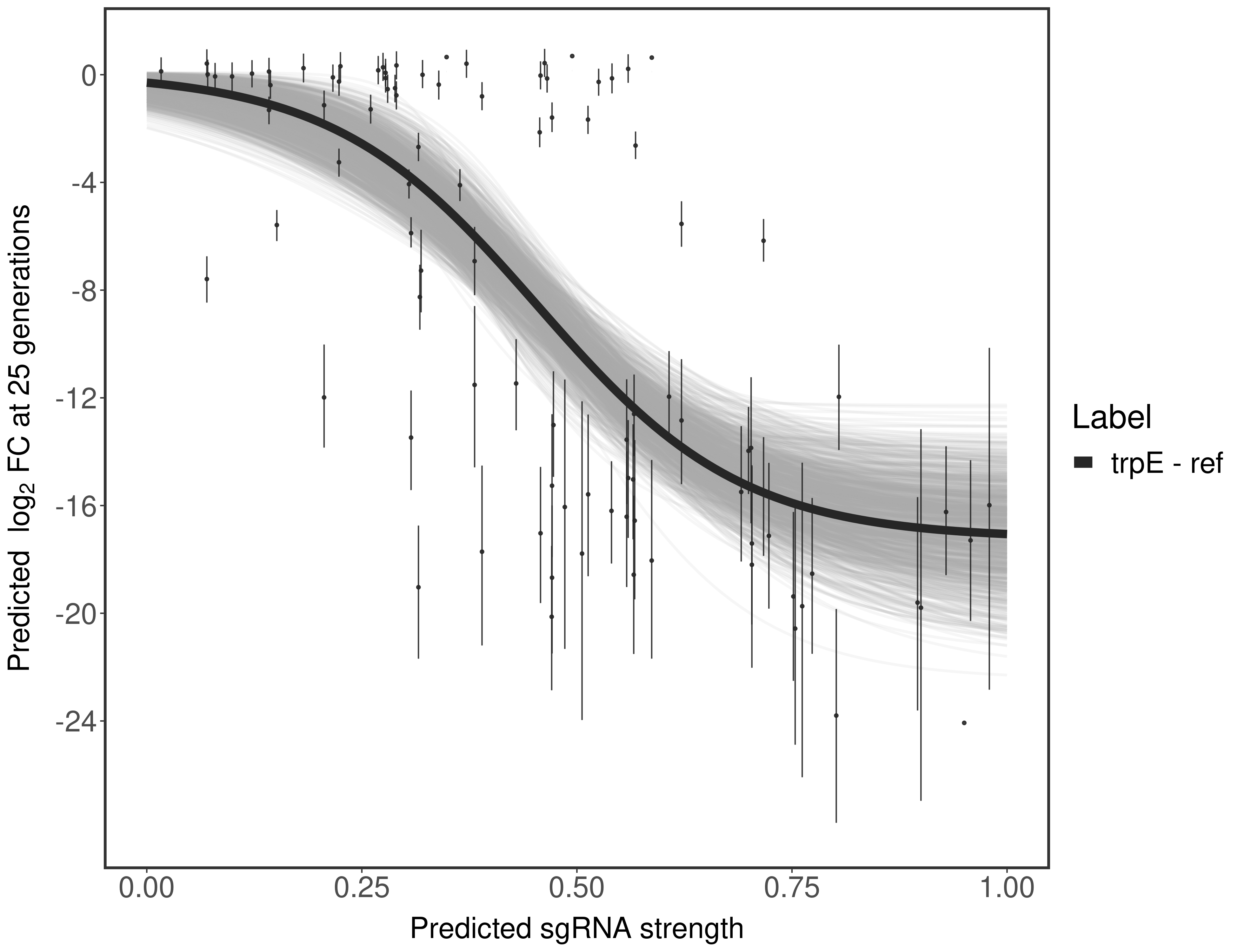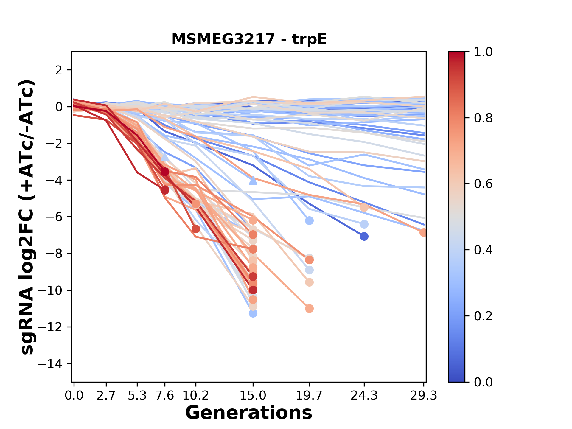 Here, we show sgRNA log2 fold-change values (L2FC) (plus versus minus ATc) over consecutive generations for sgRNAs targeting the gene you selected.