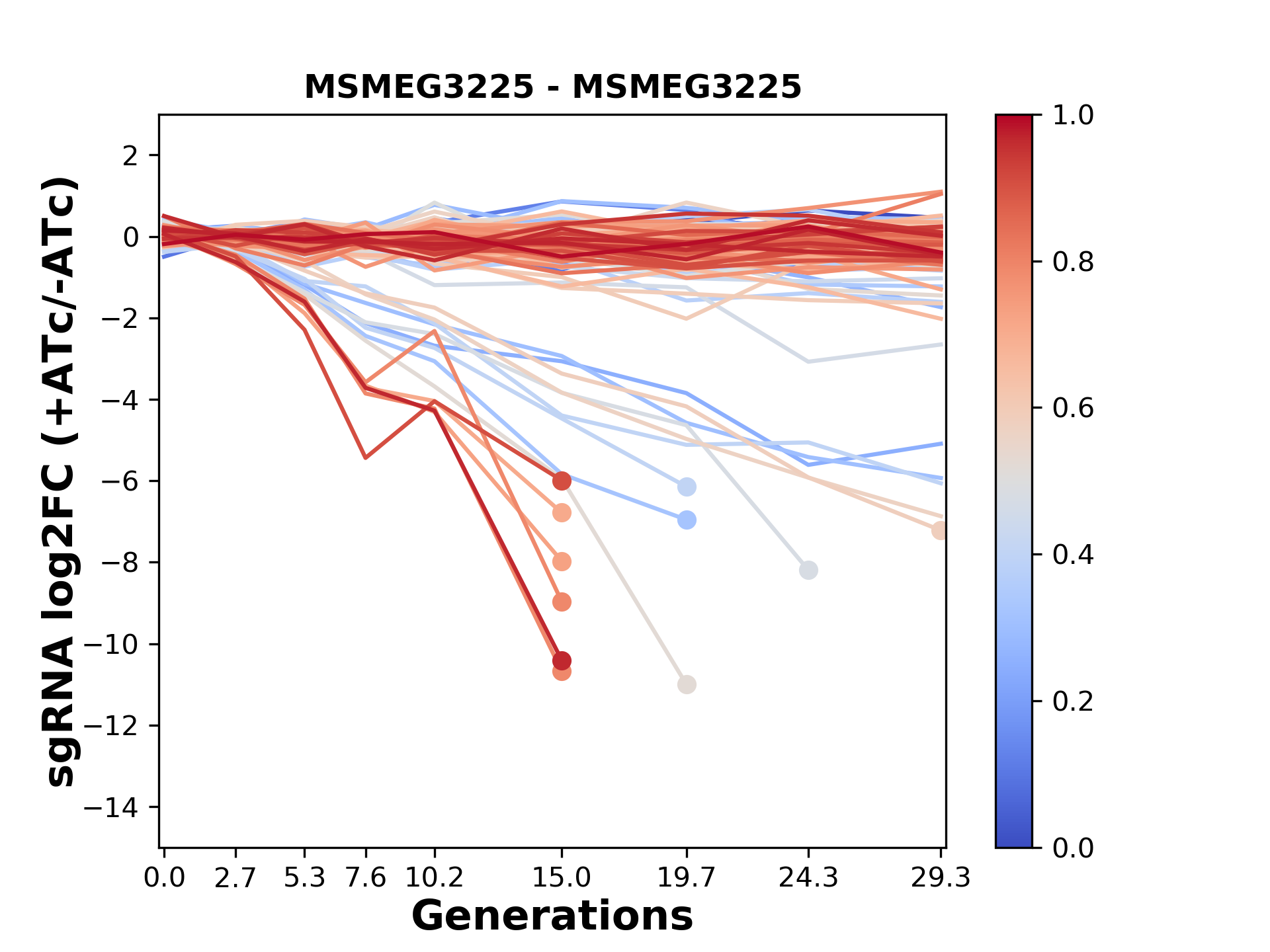 Here, we show sgRNA log2 fold-change values (L2FC) (plus versus minus ATc) over consecutive generations for sgRNAs targeting the gene you selected.