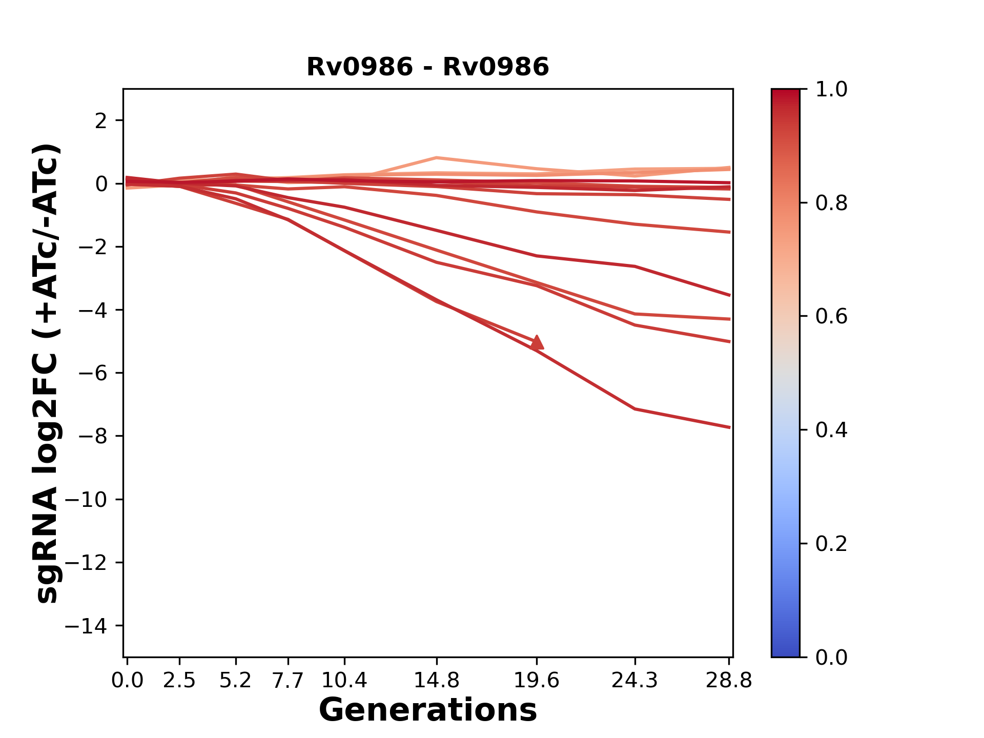 Here, we show sgRNA log2 fold-change values (L2FC) (plus versus minus ATc) over consecutive generations for sgRNAs targeting the gene you selected.