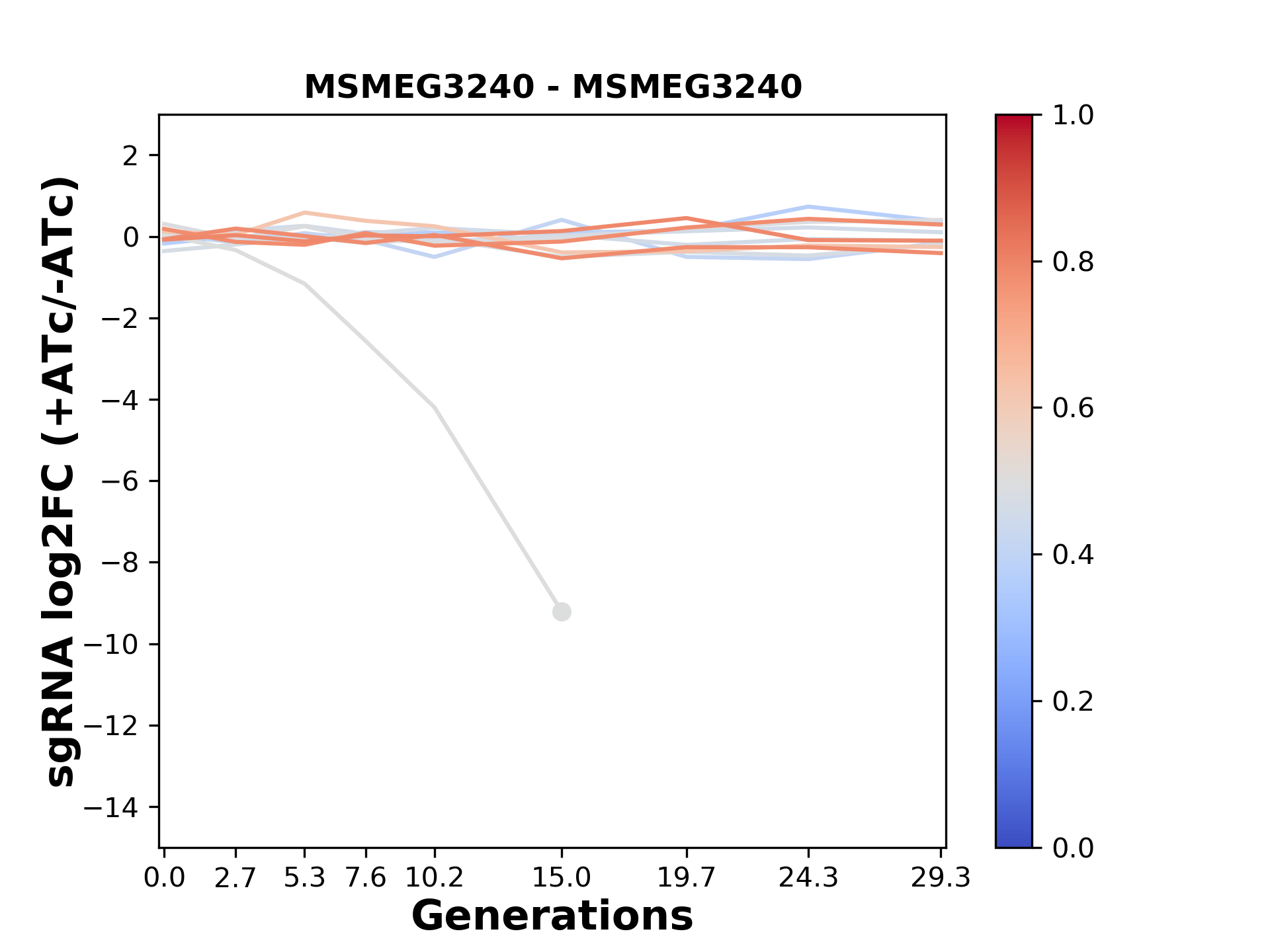 Here, we show sgRNA log2 fold-change values (L2FC) (plus versus minus ATc) over consecutive generations for sgRNAs targeting the gene you selected.