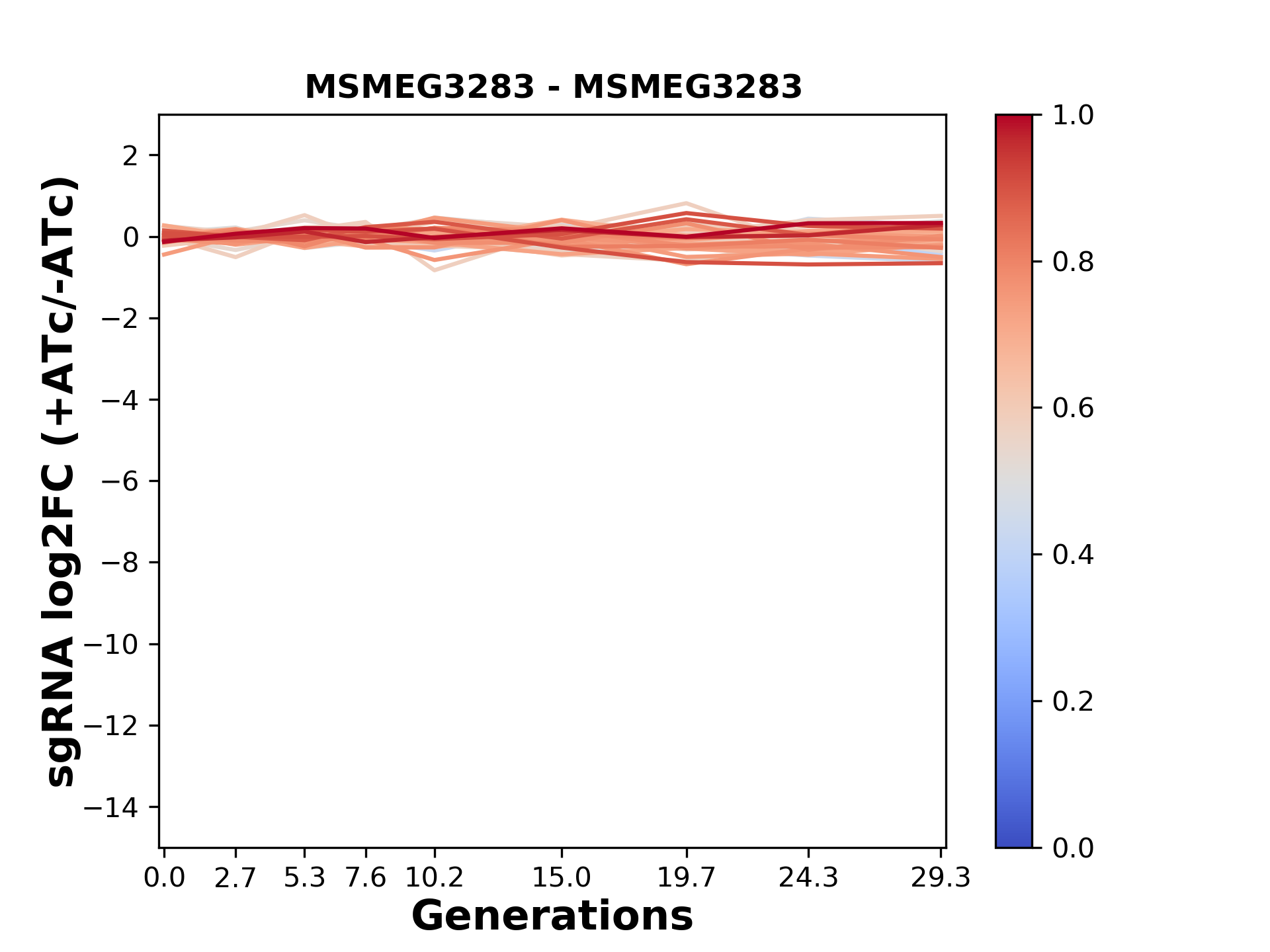 Here, we show sgRNA log2 fold-change values (L2FC) (plus versus minus ATc) over consecutive generations for sgRNAs targeting the gene you selected.