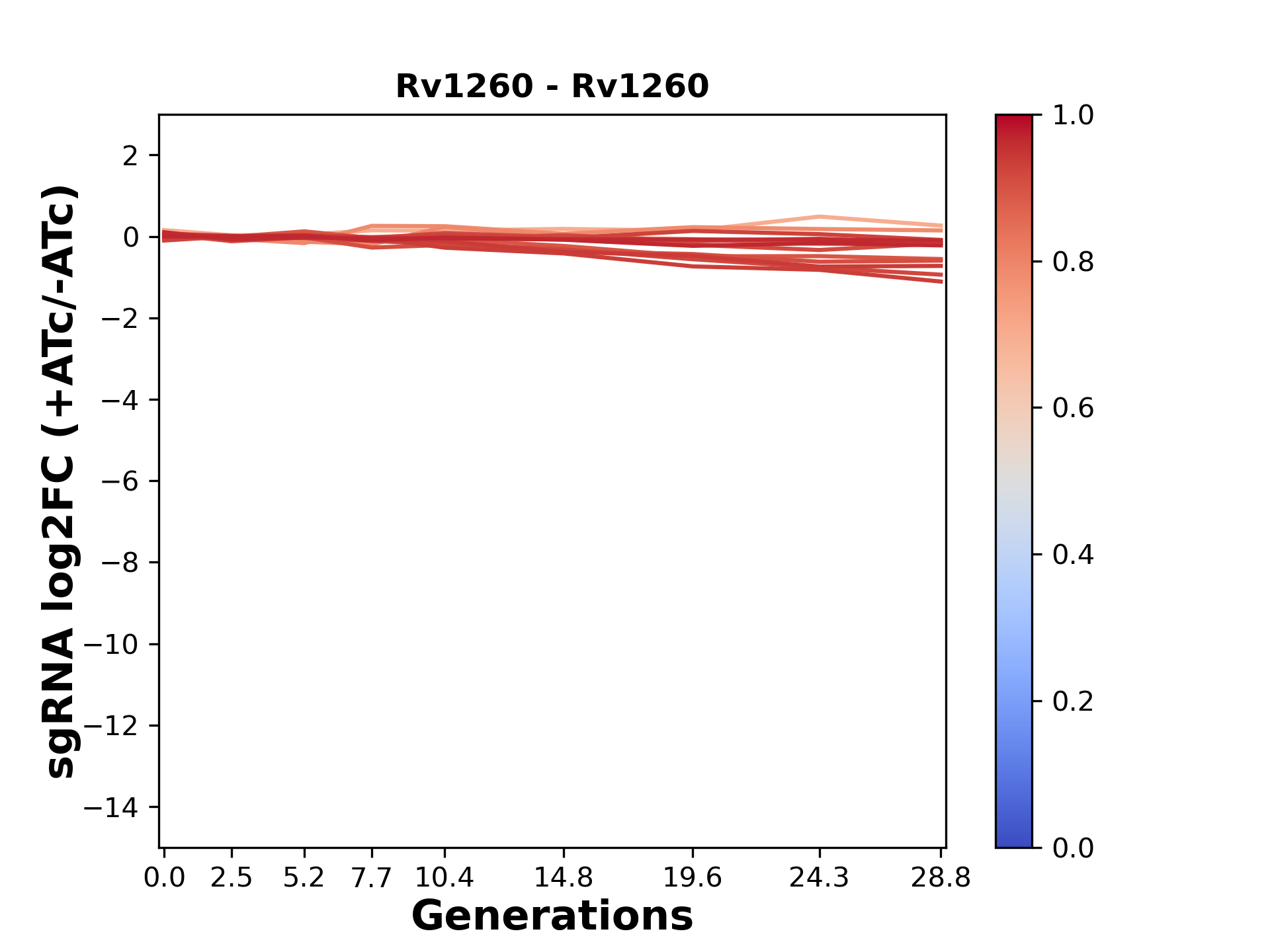 Here, we show sgRNA log2 fold-change values (L2FC) (plus versus minus ATc) over consecutive generations for sgRNAs targeting the gene you selected.