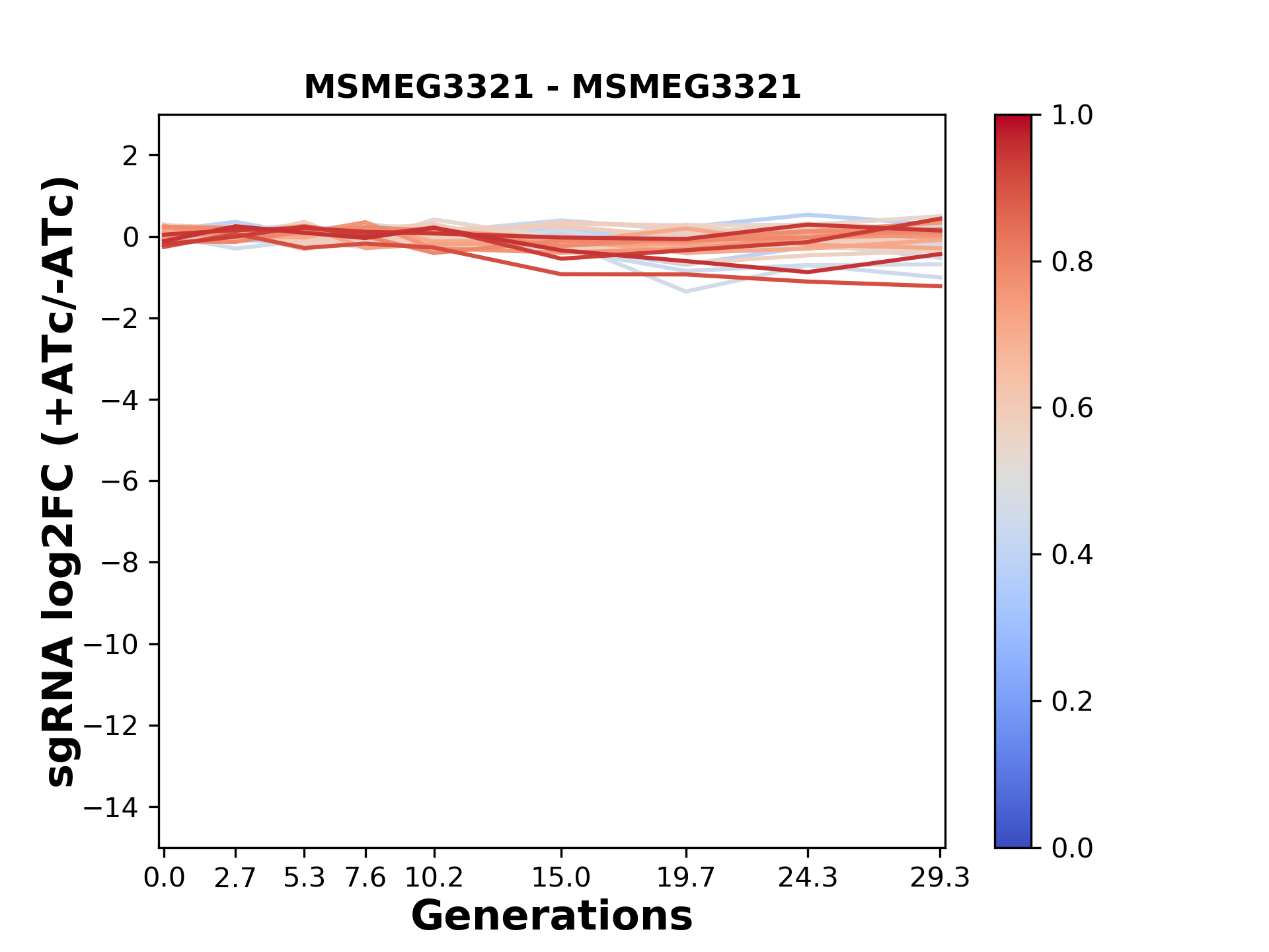 Here, we show sgRNA log2 fold-change values (L2FC) (plus versus minus ATc) over consecutive generations for sgRNAs targeting the gene you selected.