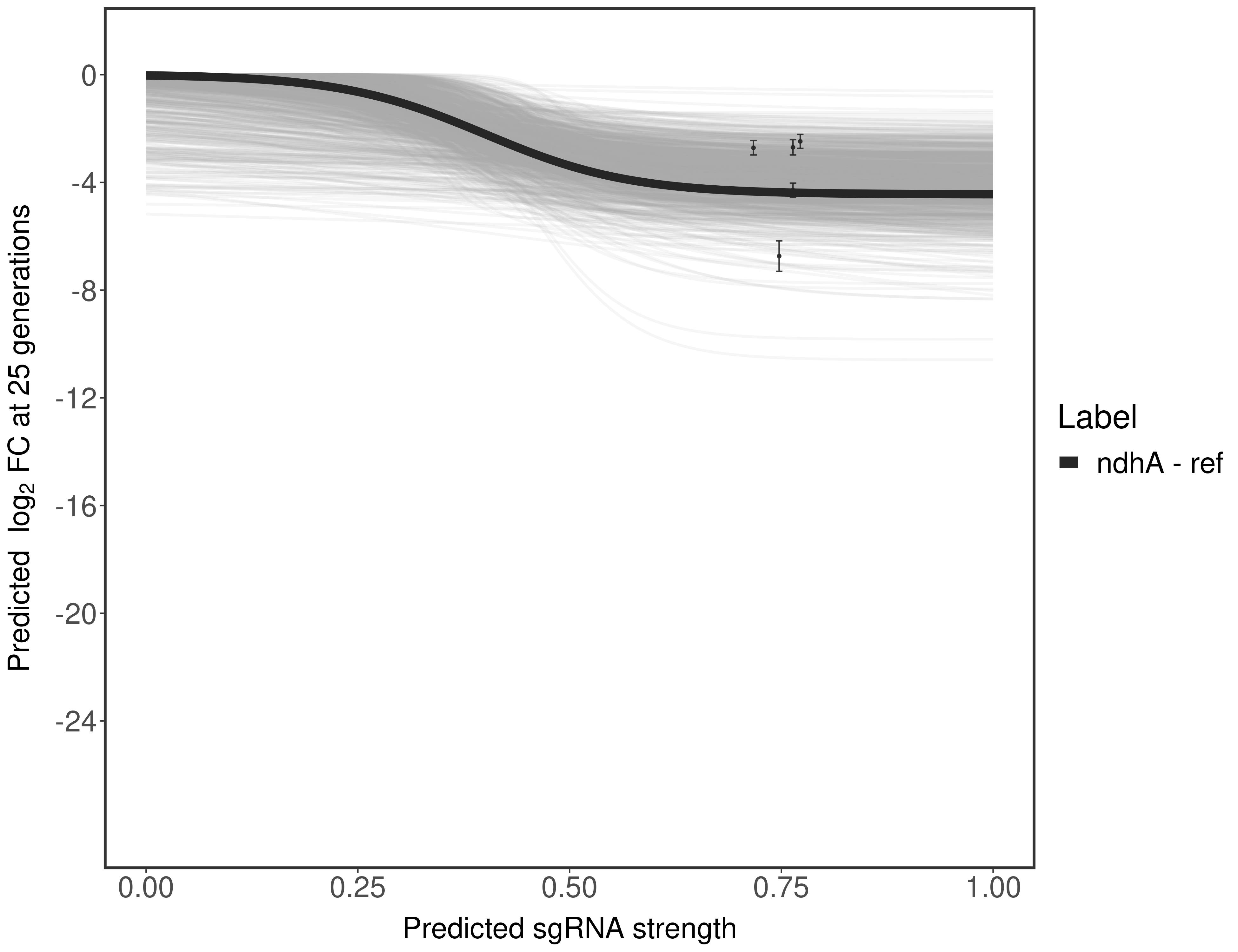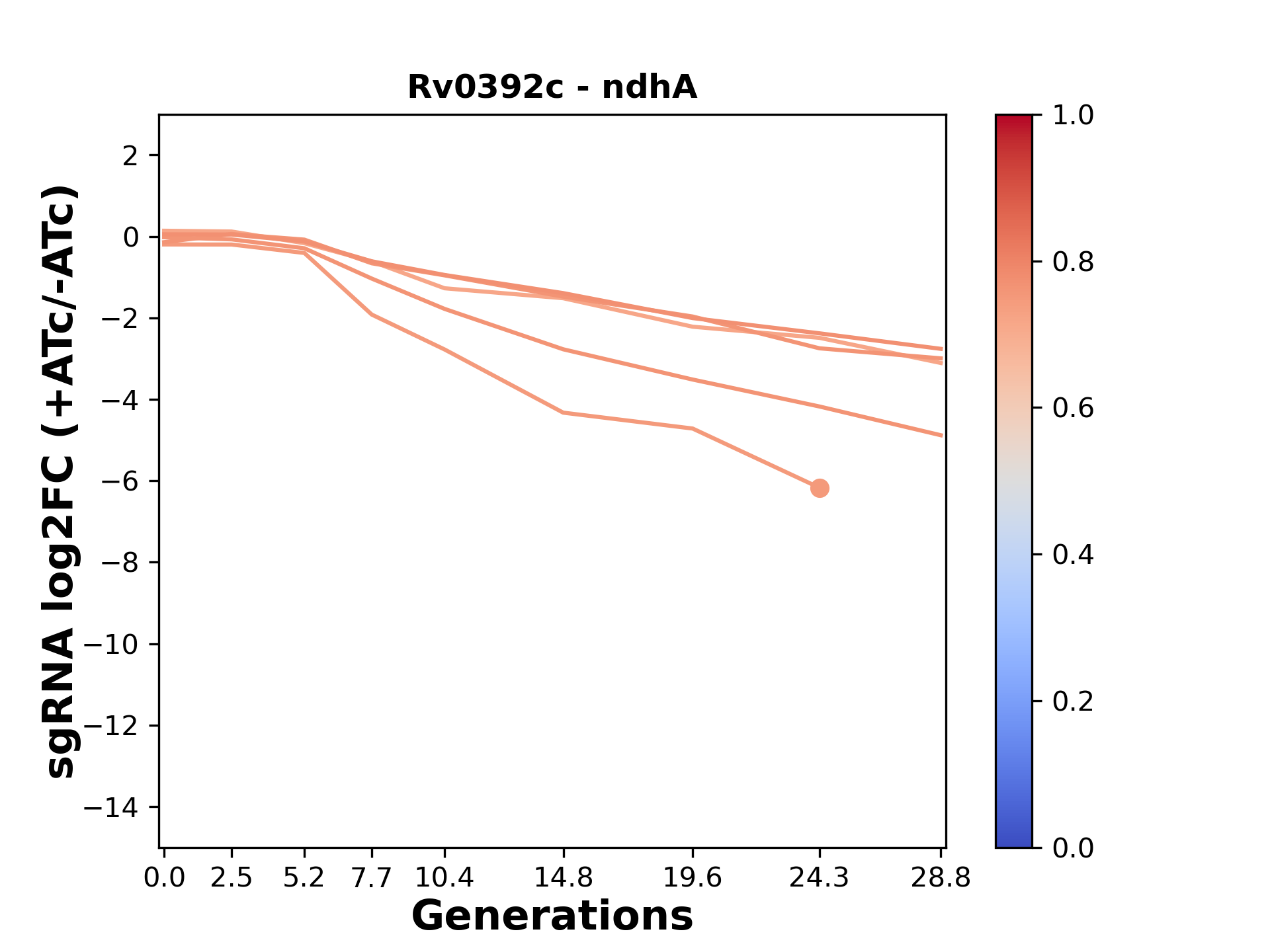 Here, we show sgRNA log2 fold-change values (L2FC) (plus versus minus ATc) over consecutive generations for sgRNAs targeting the gene you selected.