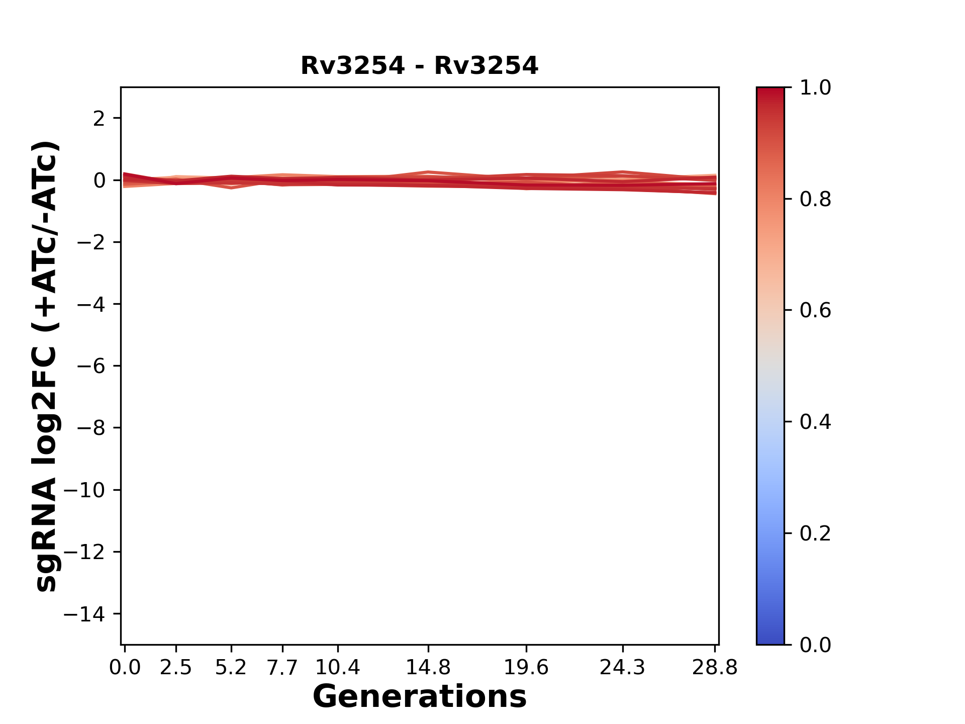 Here, we show sgRNA log2 fold-change values (L2FC) (plus versus minus ATc) over consecutive generations for sgRNAs targeting the gene you selected.