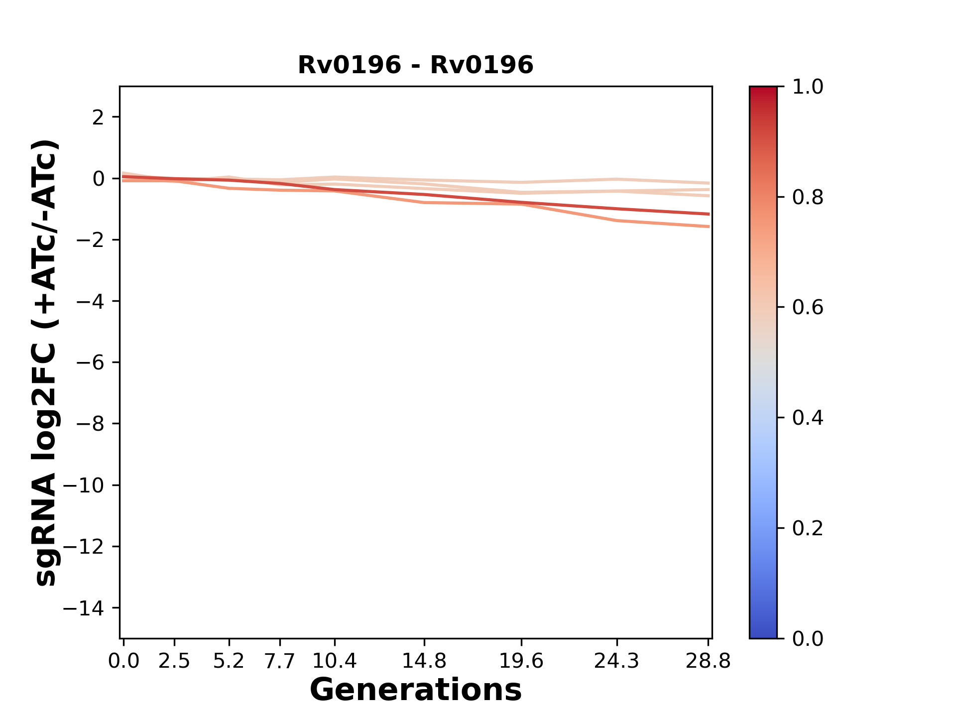 Here, we show sgRNA log2 fold-change values (L2FC) (plus versus minus ATc) over consecutive generations for sgRNAs targeting the gene you selected.