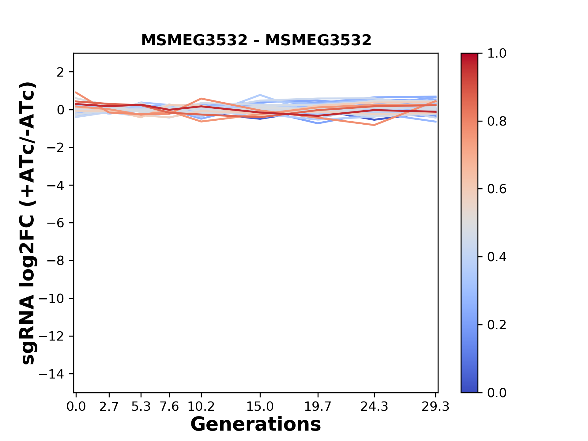 Here, we show sgRNA log2 fold-change values (L2FC) (plus versus minus ATc) over consecutive generations for sgRNAs targeting the gene you selected.