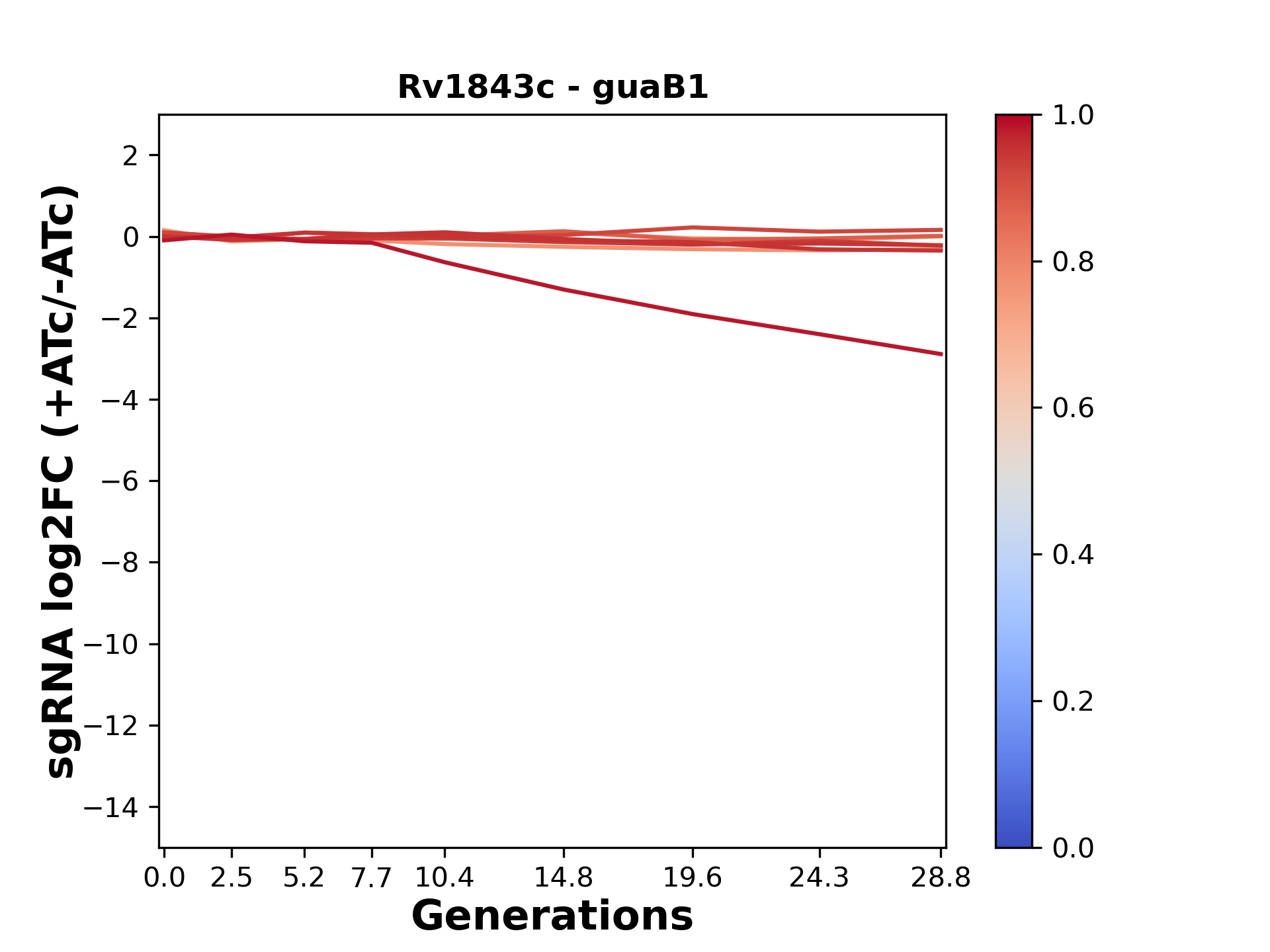 Here, we show sgRNA log2 fold-change values (L2FC) (plus versus minus ATc) over consecutive generations for sgRNAs targeting the gene you selected.