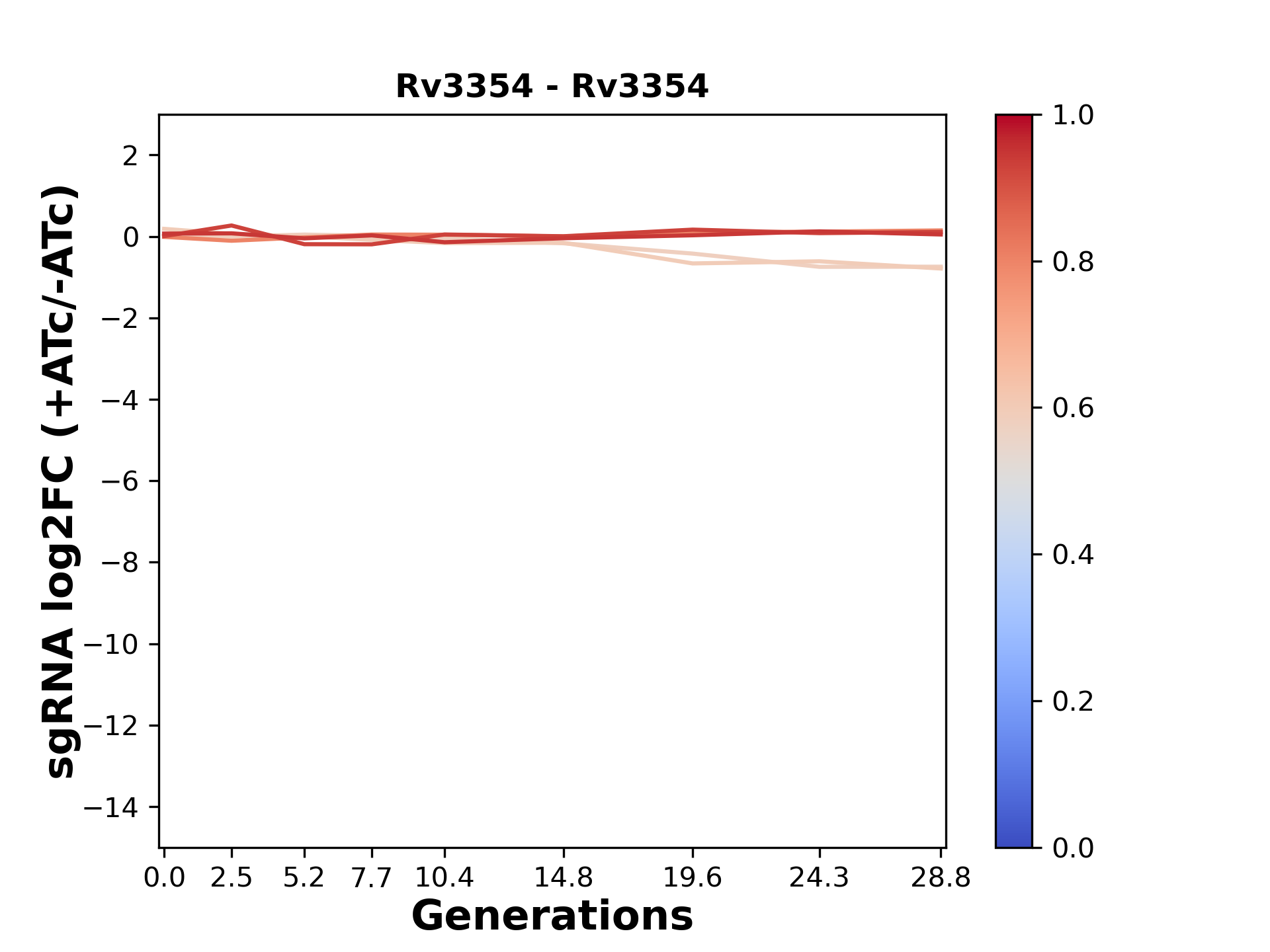 Here, we show sgRNA log2 fold-change values (L2FC) (plus versus minus ATc) over consecutive generations for sgRNAs targeting the gene you selected.