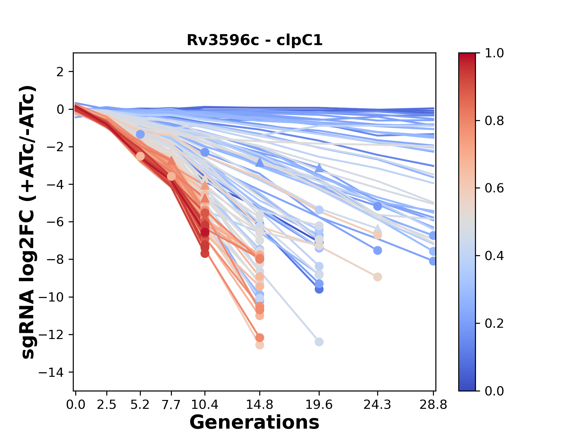 Here, we show sgRNA log2 fold-change values (L2FC) (plus versus minus ATc) over consecutive generations for sgRNAs targeting the gene you selected.