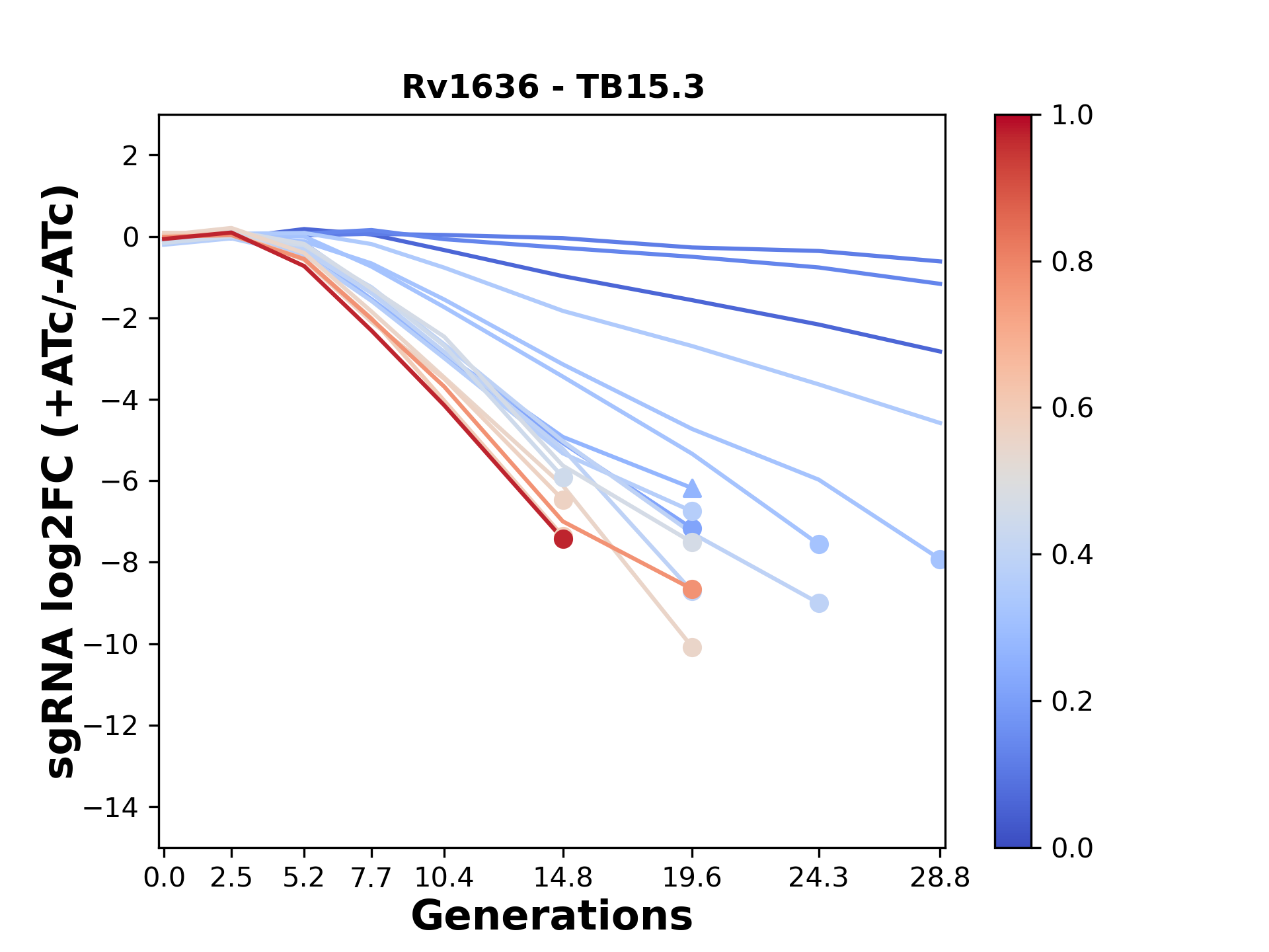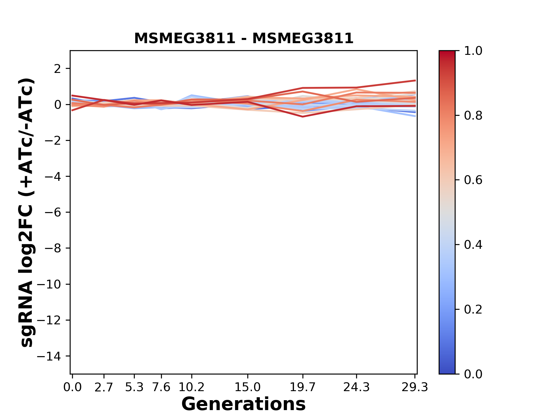 Here, we show sgRNA log2 fold-change values (L2FC) (plus versus minus ATc) over consecutive generations for sgRNAs targeting the gene you selected.