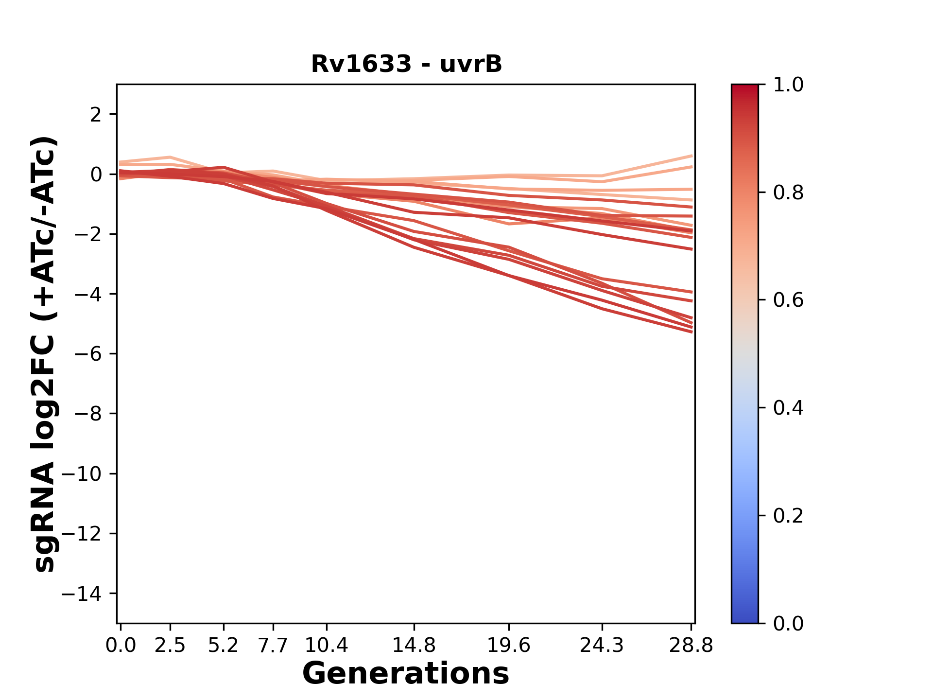 Here, we show sgRNA log2 fold-change values (L2FC) (plus versus minus ATc) over consecutive generations for sgRNAs targeting the gene you selected.
