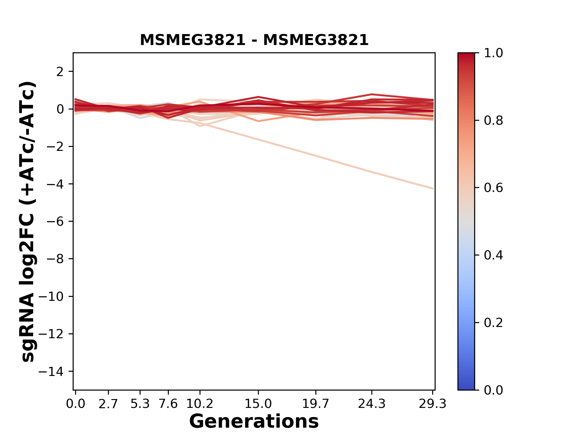 Here, we show sgRNA log2 fold-change values (L2FC) (plus versus minus ATc) over consecutive generations for sgRNAs targeting the gene you selected.